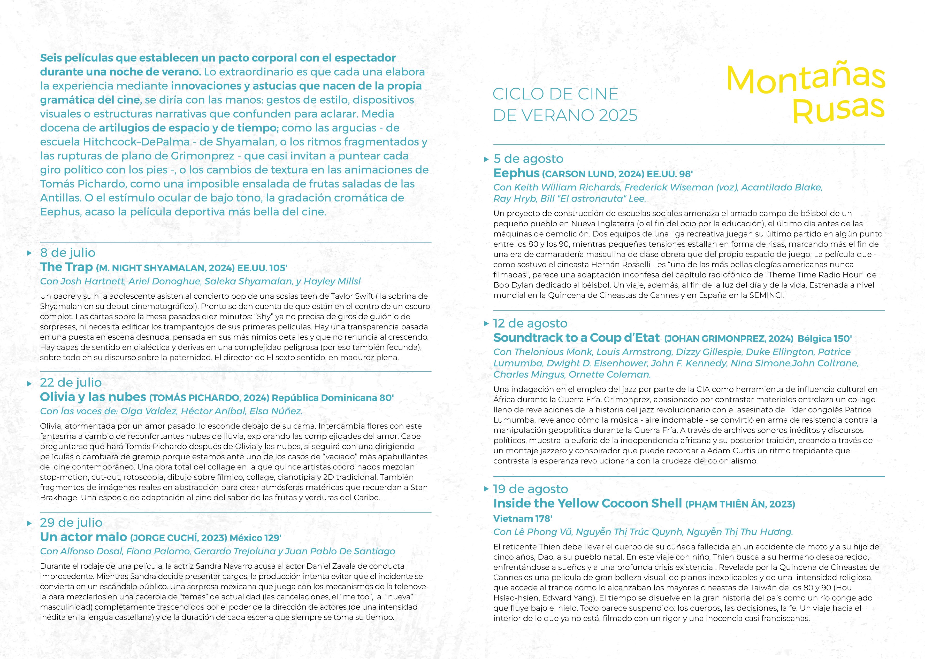 El ciclo de cine se desarrollará al aire libre en el Patio de los Reyes del Museo todos los martes del 8 de julio al 19 de agosto (a excepción del 15 de julio) a las 22:15 h. La entrada será libre hasta completar el aforo.