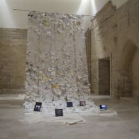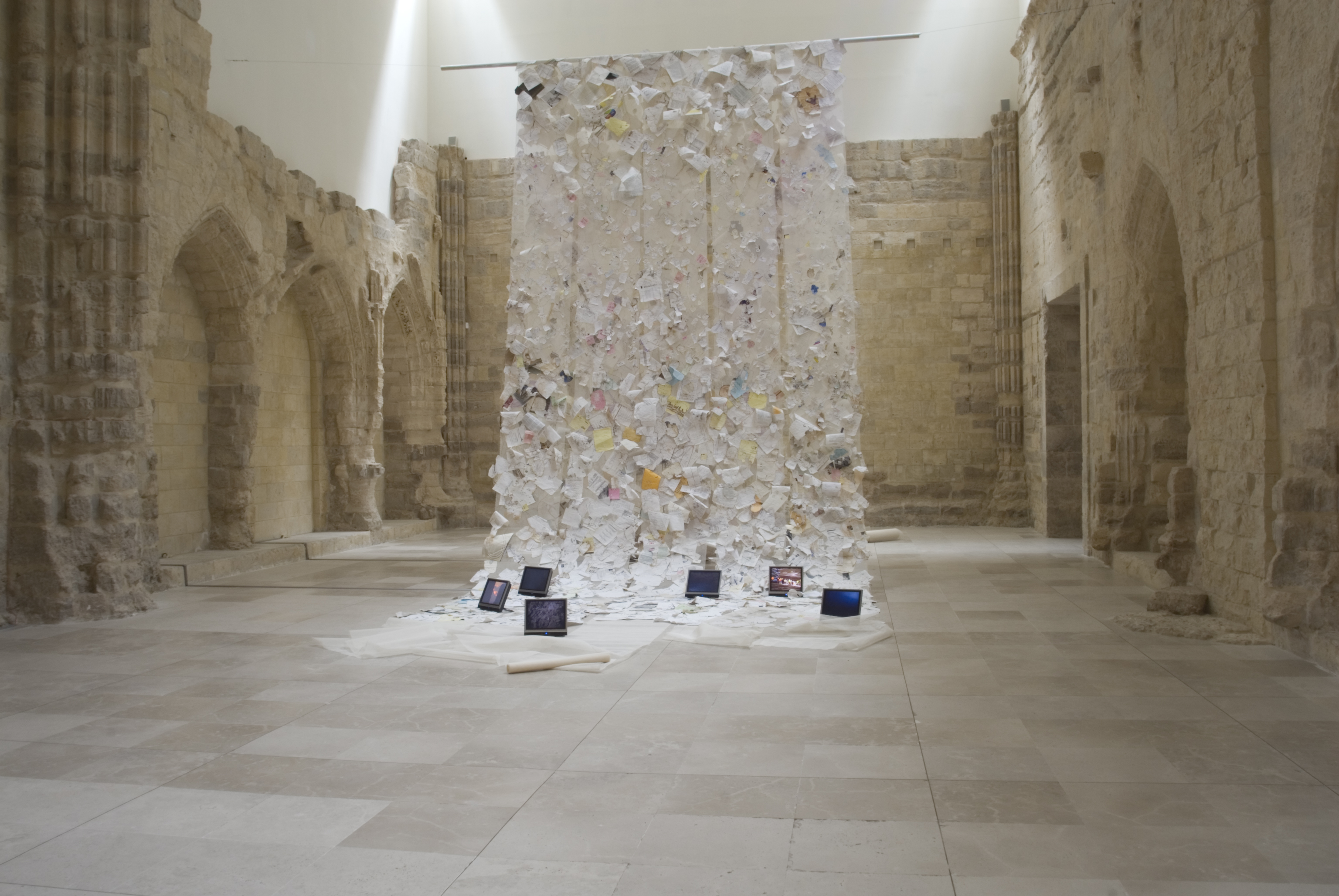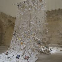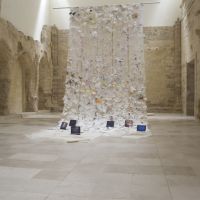 La instalación más reciente de Elena del Rivero [Sw:it] Home: A Chant (2001-2006), es un apéndice monumental de [Sw:it] Home y de todos sus trabajos que han tratado el tema de lo doméstico. Poco después de completar [Sw:it] Home, la vivienda de la artista recibió grandes daños durante los ataques al World Trade Center en Nueva York, el 11 de septiembre del 2001. Al vivir y trabajar cerca de este lugar fueron miles los papeles procedentes de las Torres Gemelas que se colaron en su apartamento-estudio cuando éstas se derrumbaron. Reaccionando de un modo caracterÃstico al desastre, integrándolo en su arte, Elena del Rivero limpió, restauró y catalogó estos restos. Quemó los nombres que en ellos aparecÃan y los cosió y bordó en cinco rollos de muselina. Esta cortina de papeles que cae en cascada se muestra en la exposición al lado de vÃdeos del lugar en tiempo real y música compuesta por Butch Morris. Todos estos elementos constituyen la pieza más elegÃaca de Elena del Rivero, dentro de un trabajo que ha buscado insistentemente disolver los lÃmites entre el arte y la vida.