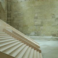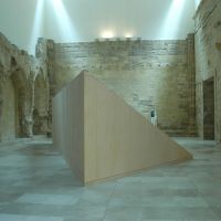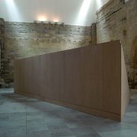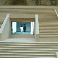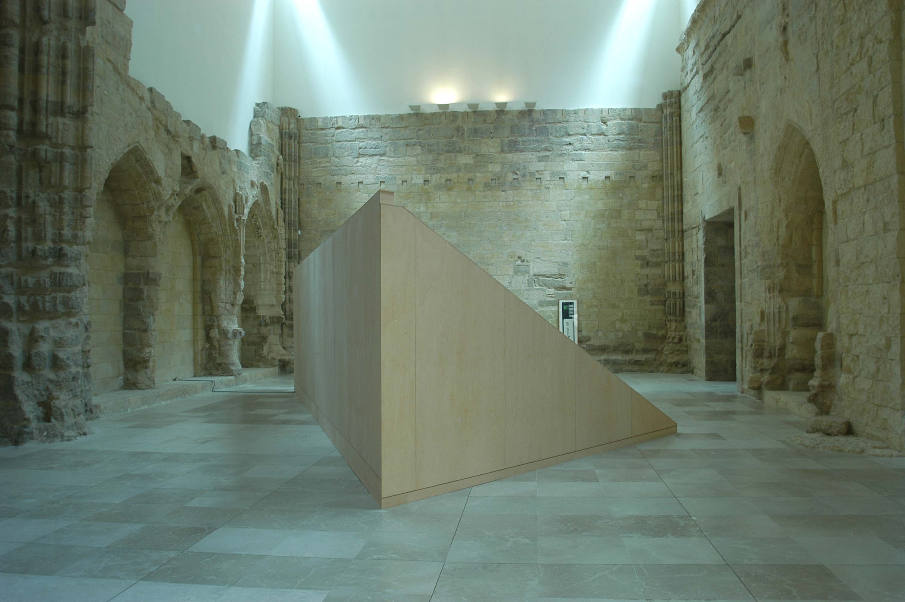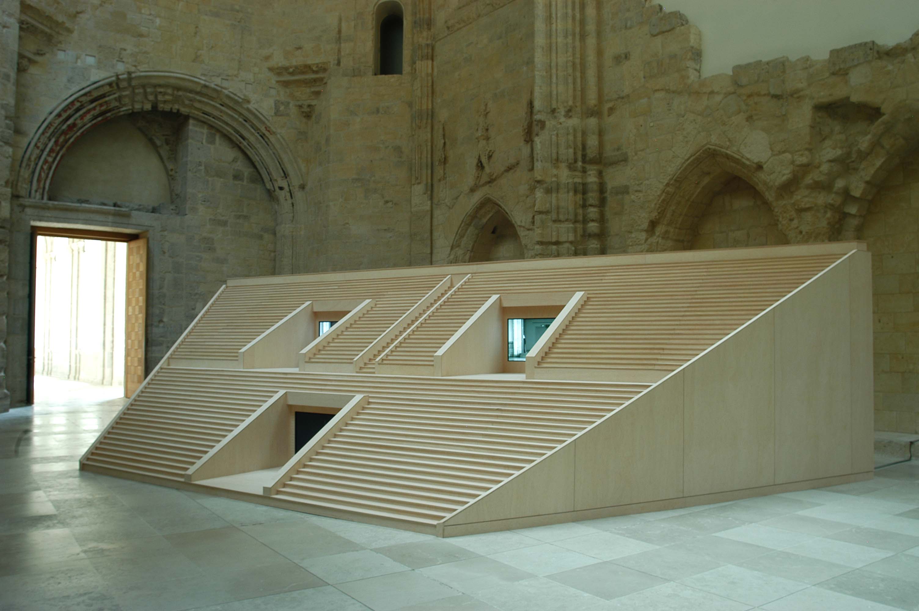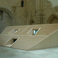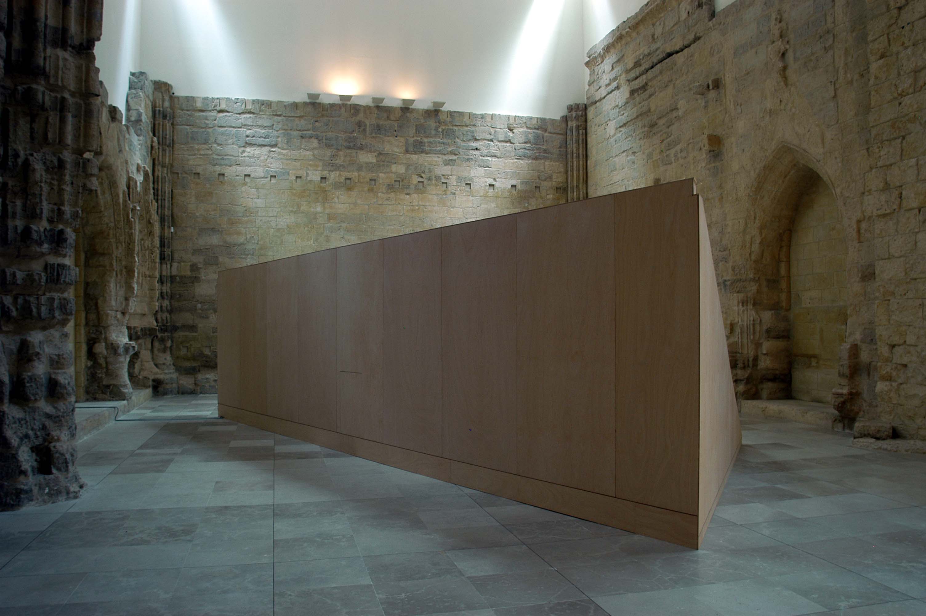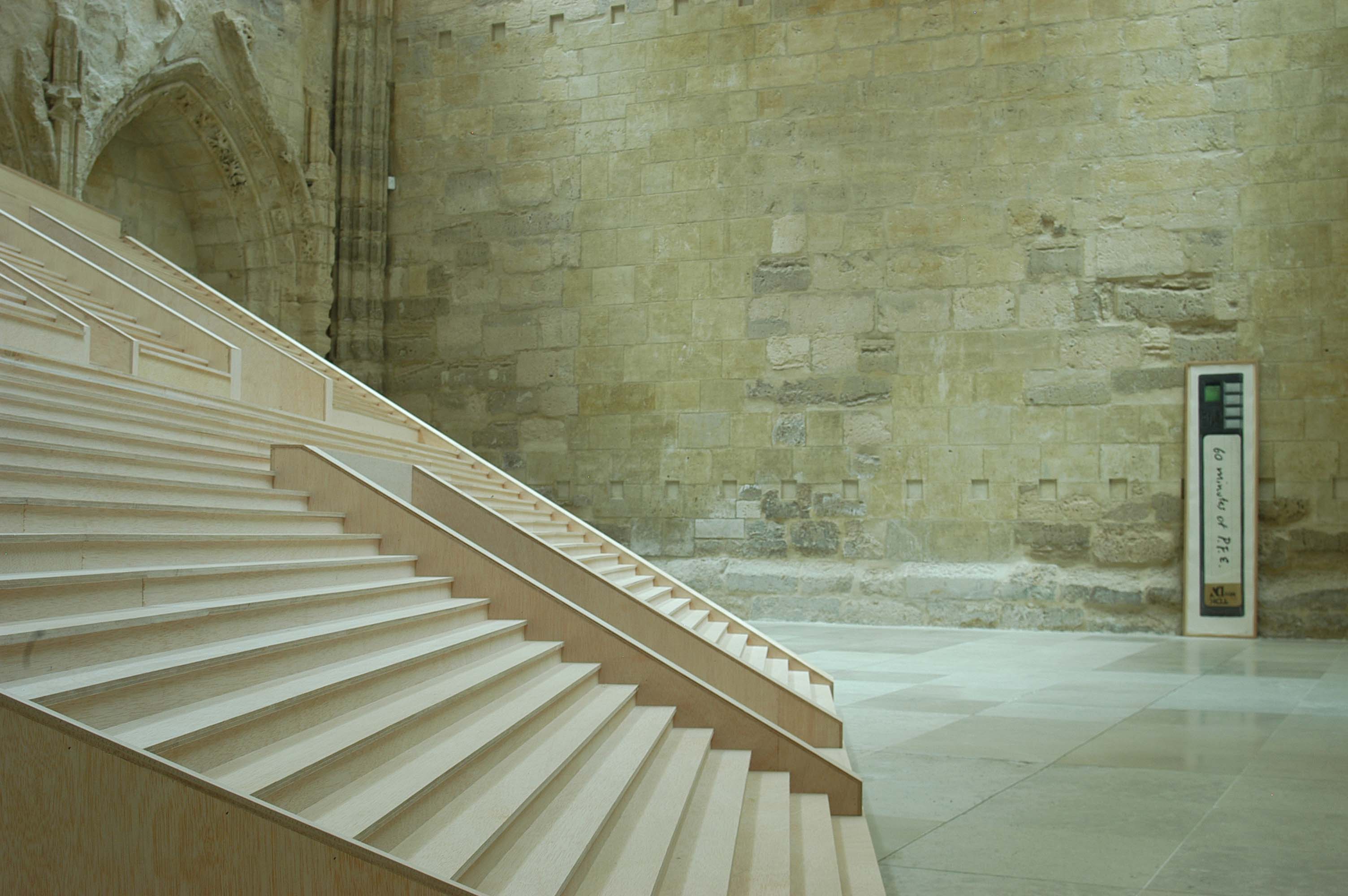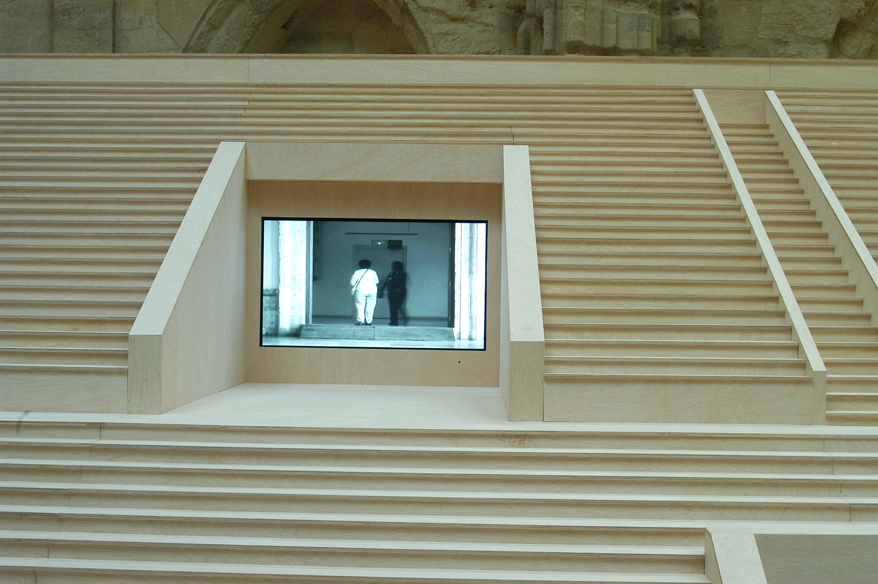 Alexandre Arrechea ha instalado en la capilla un prototipo volumétrico del clásico estadio deportivo consistente en una sección modular que está orientada longitudinalmente hacia un lado del espacio, dando la espalda a la entrada principal. Arquetipo arquitectónico del espacio social contemporáneo, el modelo presenta un pautado graderÃo ascendente con un acceso hendido en la base que se duplica en el cuerpo superior en relación proporcional a su capacidad de aforo. Mediante el uso de imágenes de vÃdeo cada uno de los tres accesos al estadio parece estar siendo virtualmente franqueado por el público. Las grabaciones muestran un flujo ininterrumpido de personas que traspasan las distintas puertas del museo y del estadio, transmitiendo una sensación de accesibilidad que contrasta con los cegados arcos ojivales de la arquitectura de la Capilla que acoge la instalación.