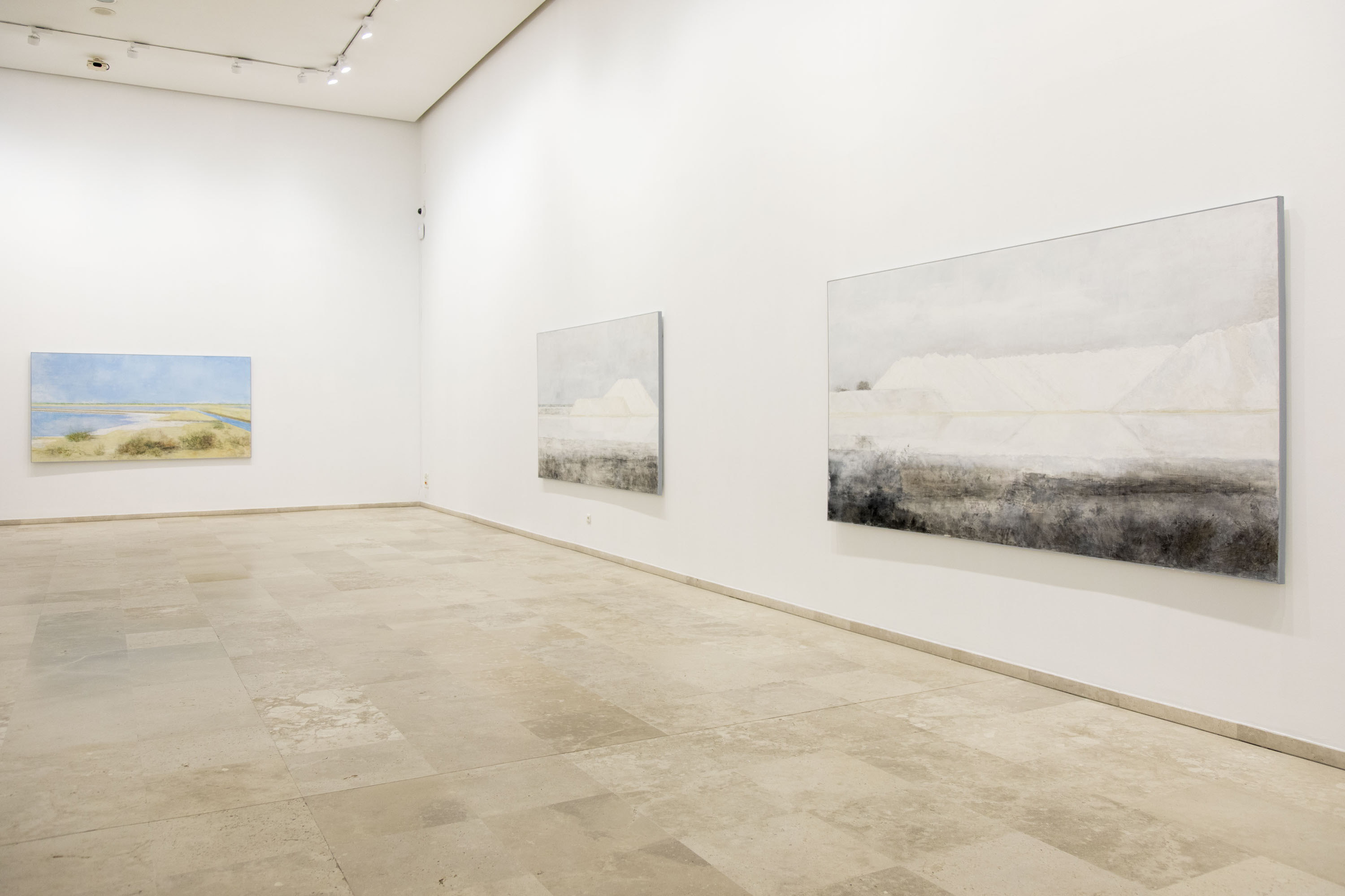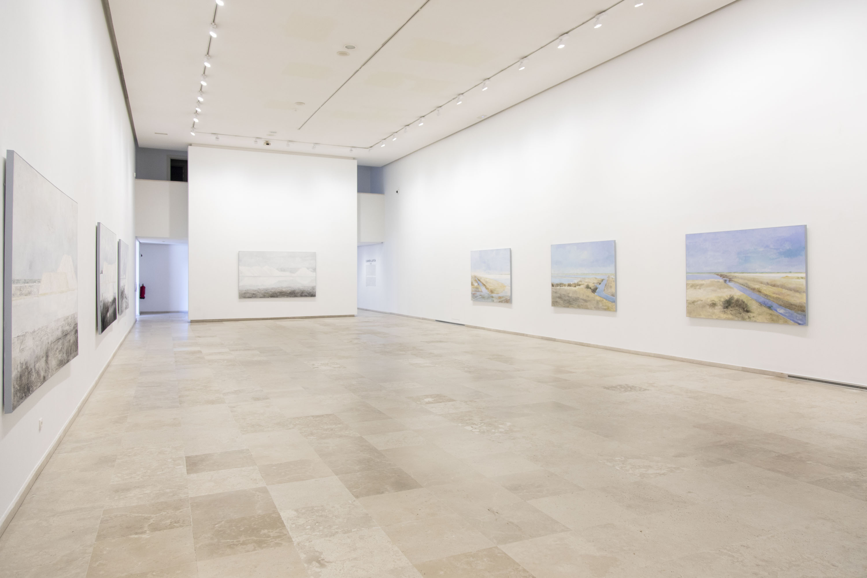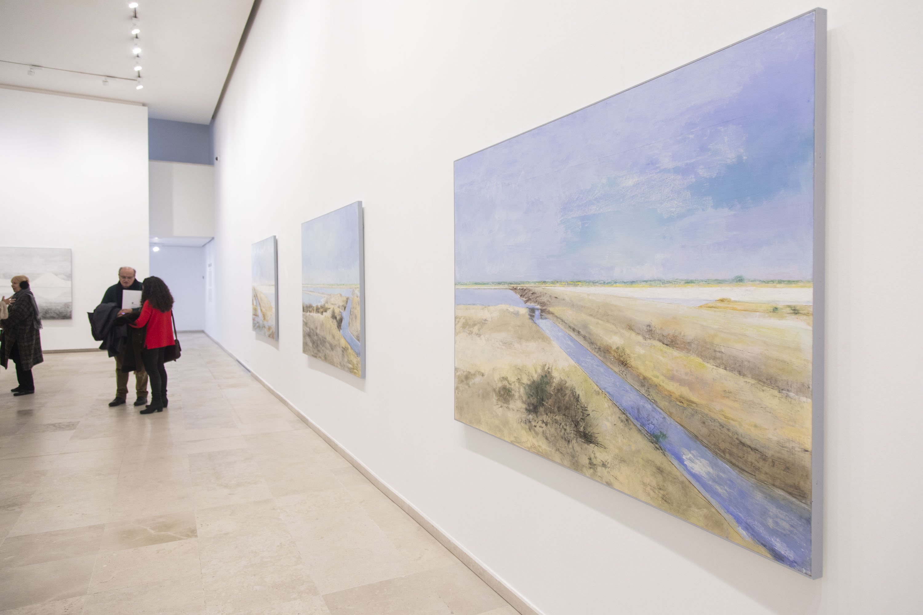 Conceived and produced in conjunction with the Andalusian Centre for Contemporary Art in Seville, the exhibition La sal (Salt) by Carmen Laffón (Seville, 1934) brings together a dozen large-format pieces recently produced by the artist. Laffón, one of the most significant painters from the second half of the twentieth century who is still active, once again shows an interest in observing the place, an exercise in which the desire to narrate does not exclude powerful emotional content. This has been the tone since those outstanding drawings and paintings produced on the Isla de la Cartuja in the late 1960s, in which an eminently modern, even political, mood was revealed in her assertive commitment to the real. The pieces brought together in this exhibition provide us with an equally attentive look at the salt flats of Sanlúcar de Barrameda, Cádiz; hence the title. The area at the mouth of the River Guadalquivir, between Cadiz and Huelva, and with the Doñana Nature Reserve as a motif and privileged witness of the picture, is the place from which the artist has displayed her loosest and freest painting. It is also the most ambitious, as the formats she employs here are unusually large. The paintings in concentrated shades of grey and those in fiery blue reveal an interest in serial work and focus on the careful study of certain places – the salt flats which are perhaps not the most common motif in the tradition of landscape painting. This is where her modernity lies. The paintings may perhaps belong more to the field of photography, but the importance of the workmanship and the material distances them from the objective nature of photography.