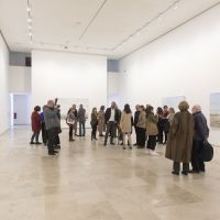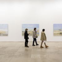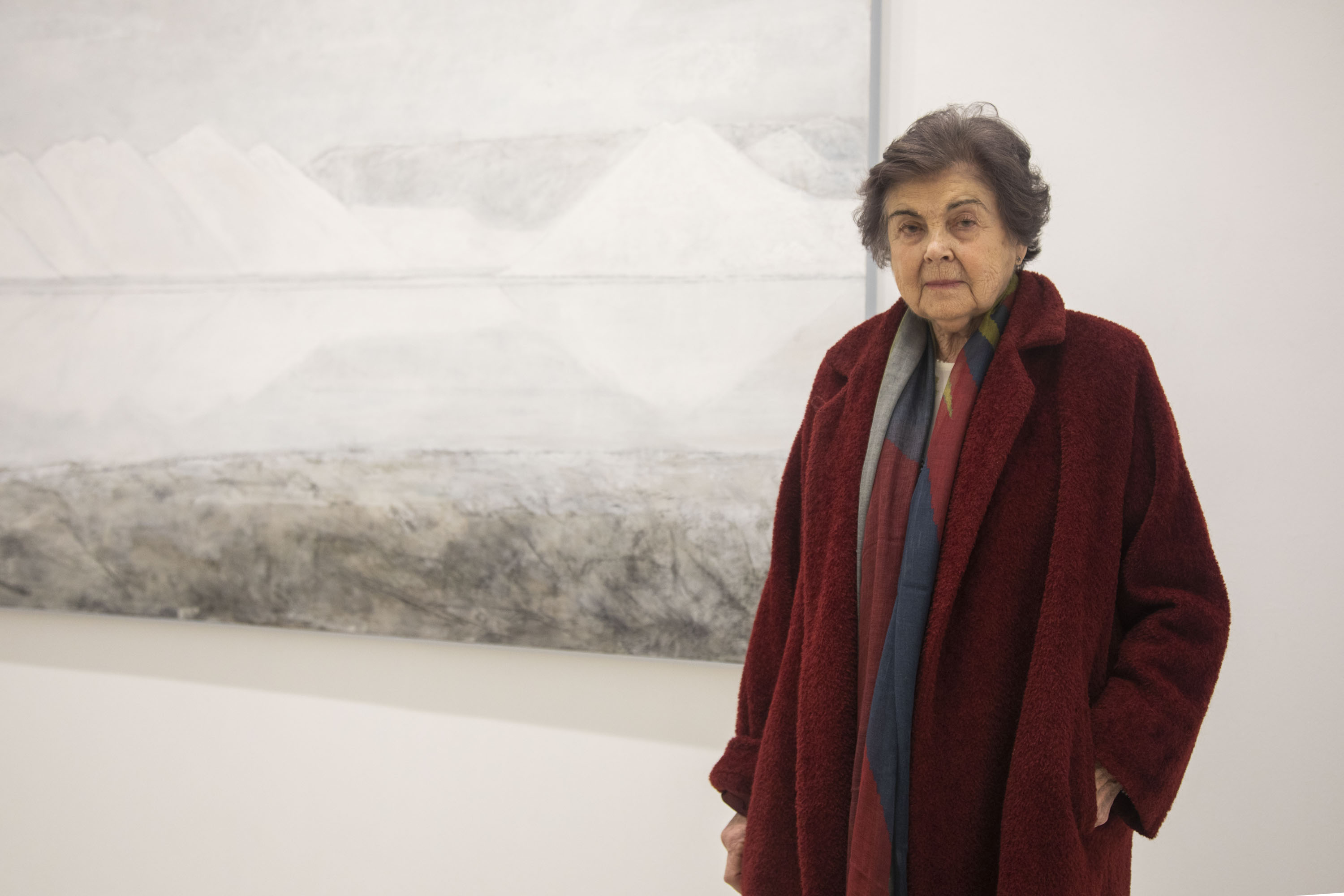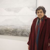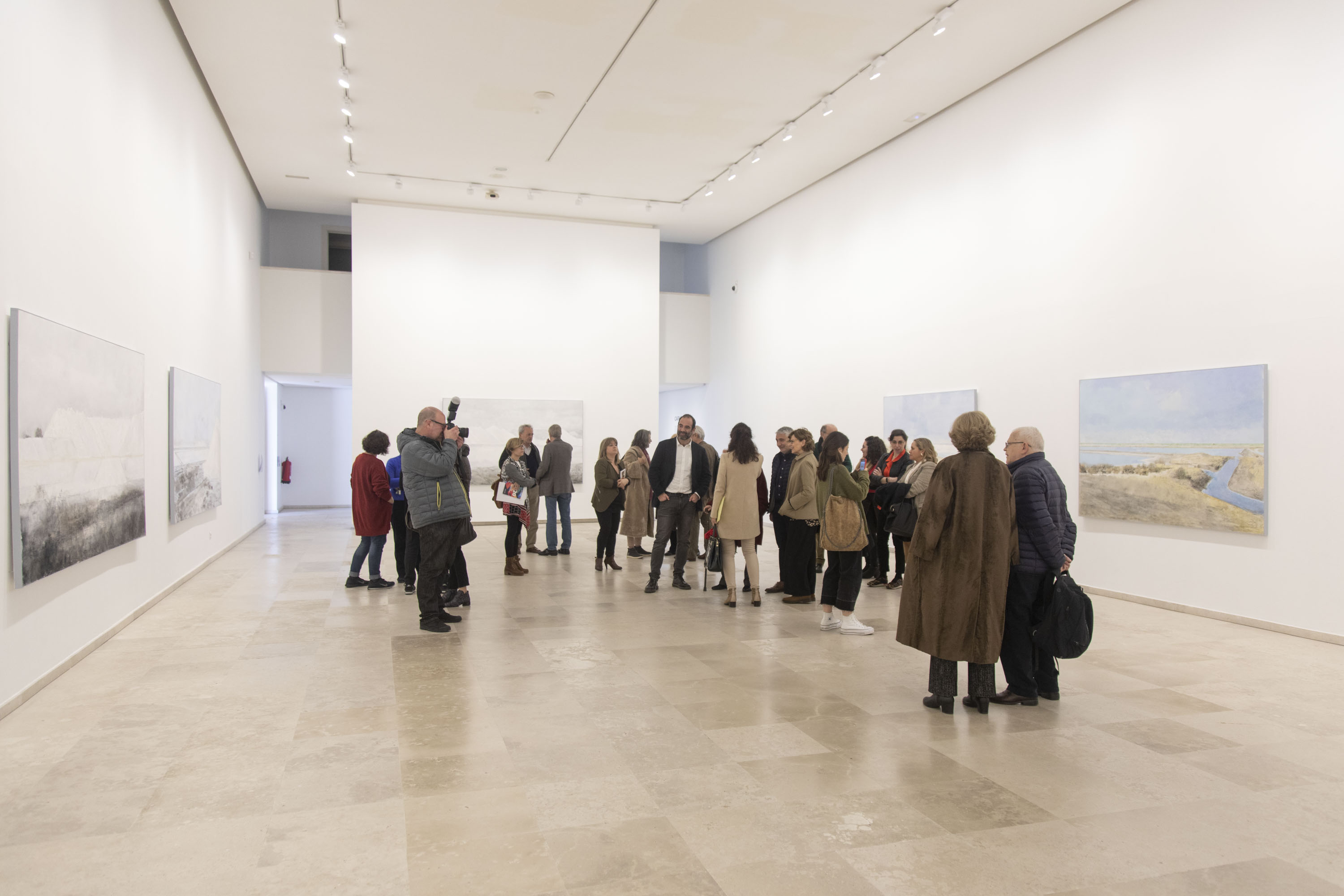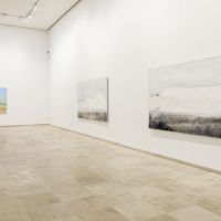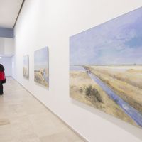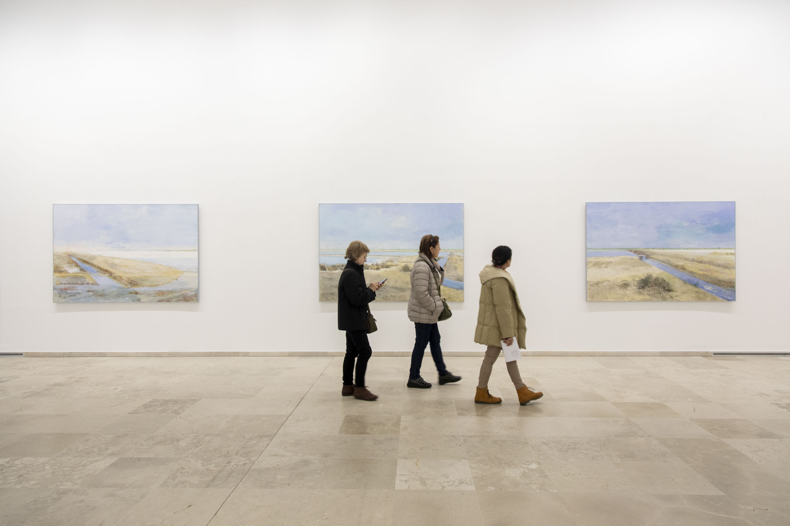 Conceived and produced in conjunction with the Andalusian Centre for Contemporary Art in Seville, the exhibition La sal (Salt) by Carmen Laffón (Seville, 1934) brings together a dozen large-format pieces recently produced by the artist. Laffón, one of the most significant painters from the second half of the twentieth century who is still active, once again shows an interest in observing the place, an exercise in which the desire to narrate does not exclude powerful emotional content. This has been the tone since those outstanding drawings and paintings produced on the Isla de la Cartuja in the late 1960s, in which an eminently modern, even political, mood was revealed in her assertive commitment to the real. The pieces brought together in this exhibition provide us with an equally attentive look at the salt flats of Sanlúcar de Barrameda, Cádiz; hence the title. The area at the mouth of the River Guadalquivir, between Cadiz and Huelva, and with the Doñana Nature Reserve as a motif and privileged witness of the picture, is the place from which the artist has displayed her loosest and freest painting. It is also the most ambitious, as the formats she employs here are unusually large. The paintings in concentrated shades of grey and those in fiery blue reveal an interest in serial work and focus on the careful study of certain places – the salt flats which are perhaps not the most common motif in the tradition of landscape painting. This is where her modernity lies. The paintings may perhaps belong more to the field of photography, but the importance of the workmanship and the material distances them from the objective nature of photography.