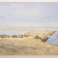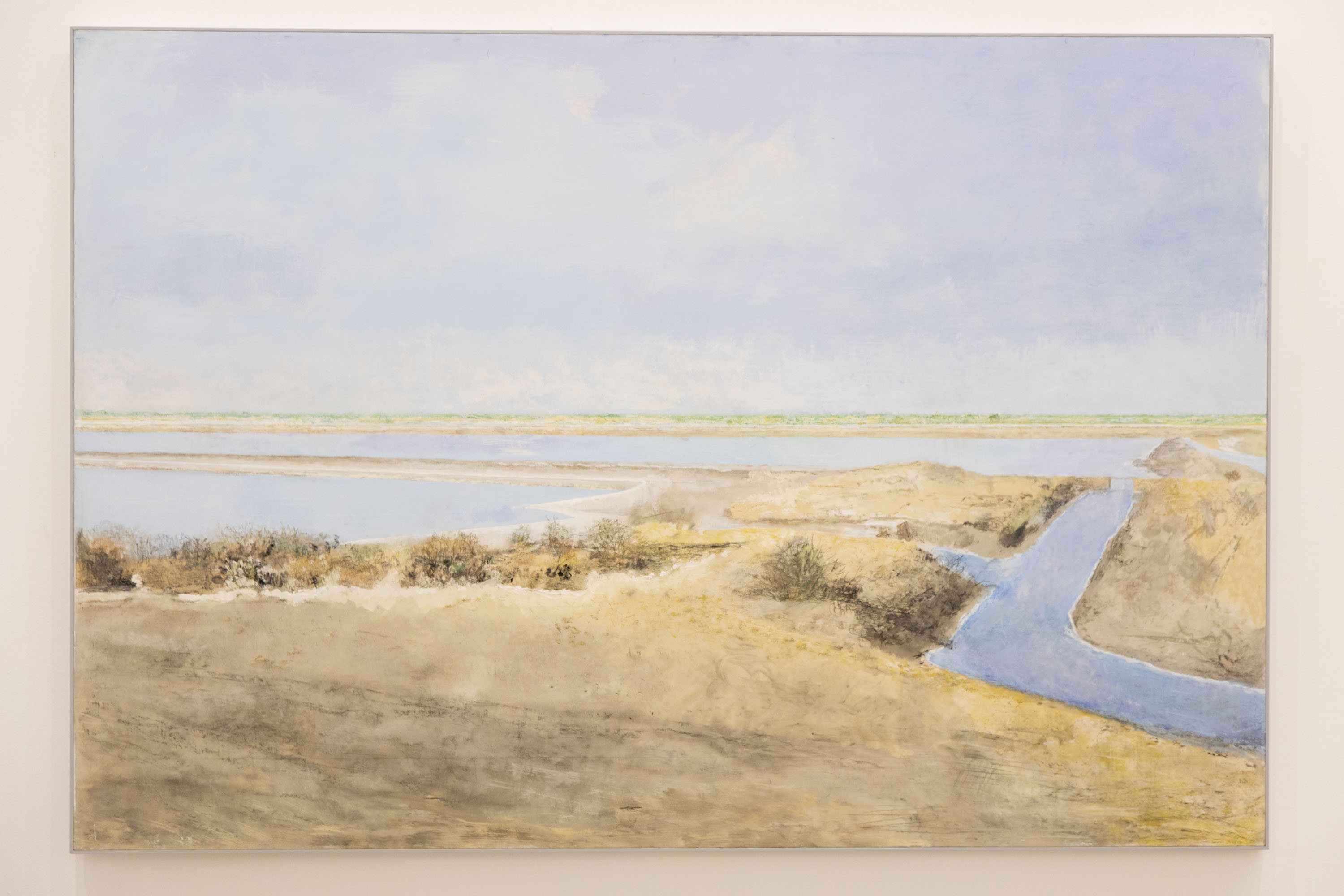 Next to the salt pans we see another group of paintings that are radically different in their treatment of colour, paintings that share the same luminous intensity and a composition that revolves around the iron-clad line of the horizon. In Carmen Laffón’s latest painting the horizon plays an essential role. There is nothing like sitting in front of the mouth of the River Guadalquivir, facing the Doñana Nature Reserve, to perceive the powerful horizontal axis that presides over the scene. If in the images of the Nature Reserve, produced over almost a decade from 2005 to 2014, the horizon was already the main player in pictures of the same format characterized by a melancholic treatment of the image, these latter pictures delve into the geographical uniqueness of the landscape, modelled by centuries of historical vicissitudes that have conditioned the physical, economic and social situation of the area. Laffón thus links up to those early works from the 1960s that dealt with the transformations of the Island of La Cartuja in Seville, and thus revitalizes her relationship with the landscape, which from untiring activity transcends the conventions of the genre.