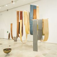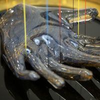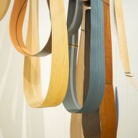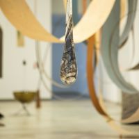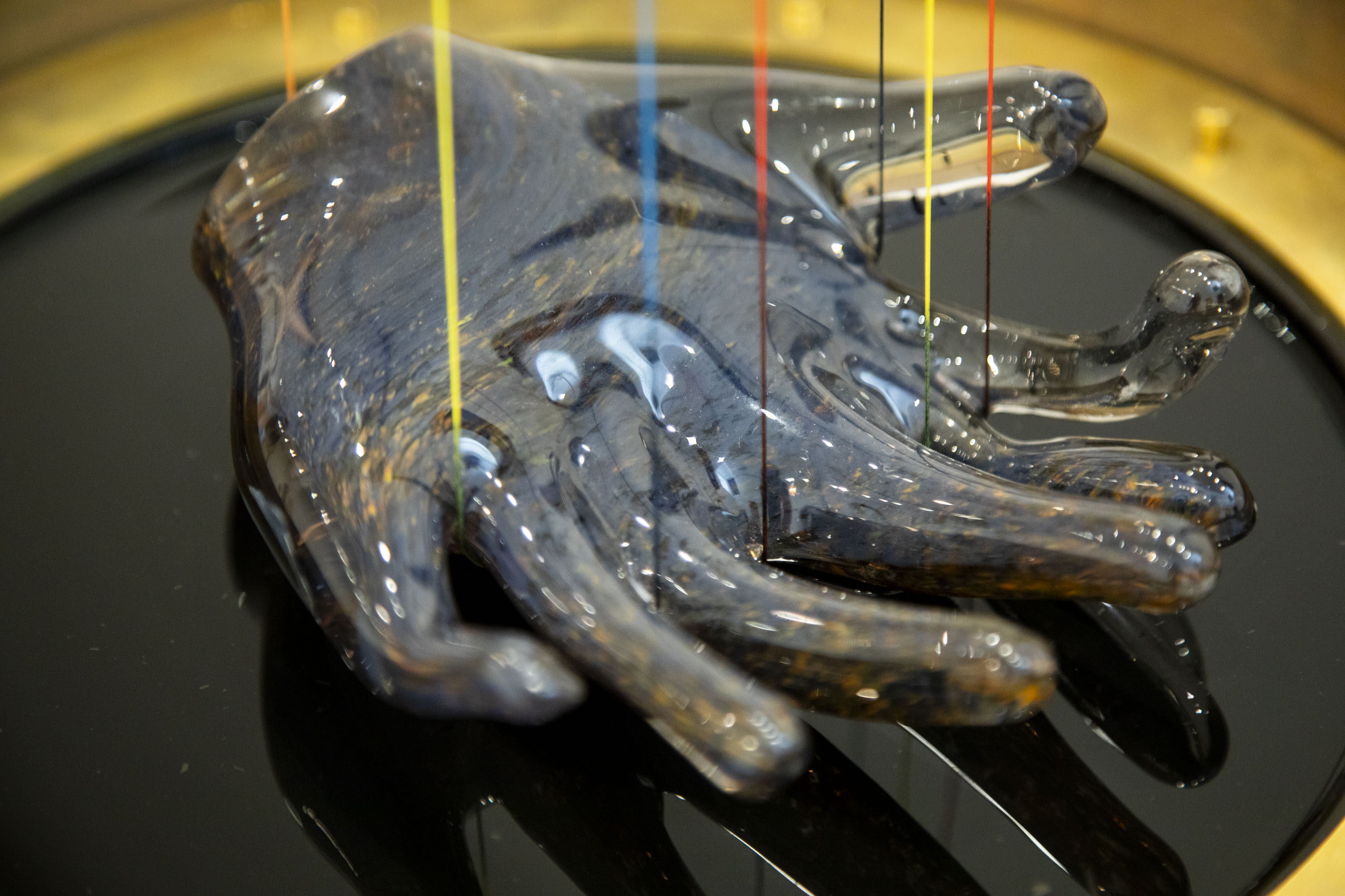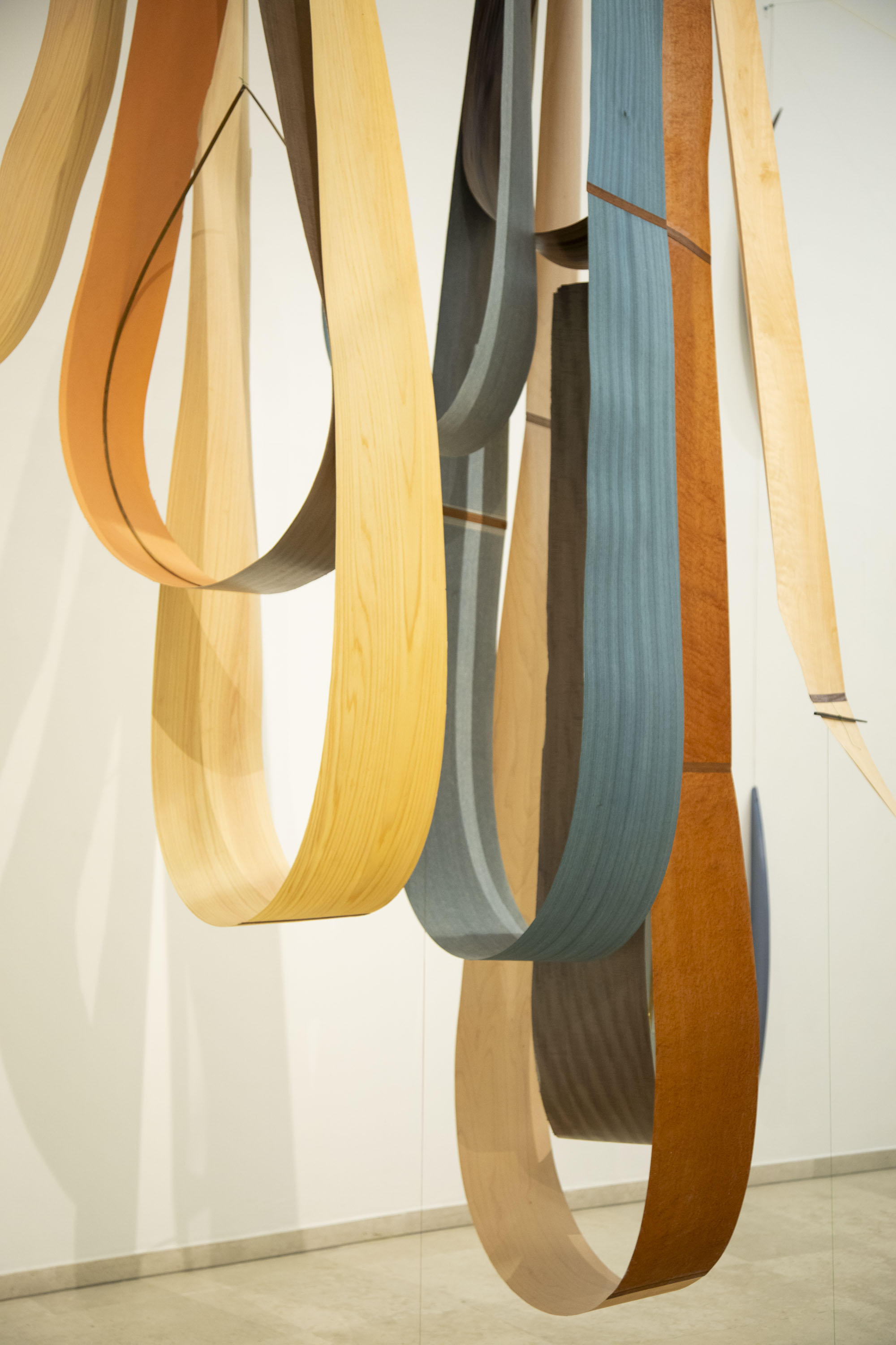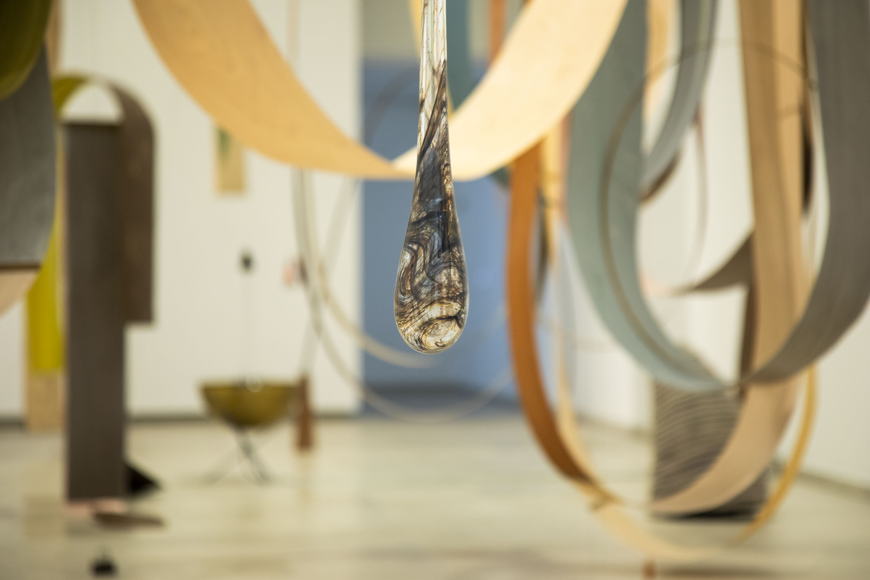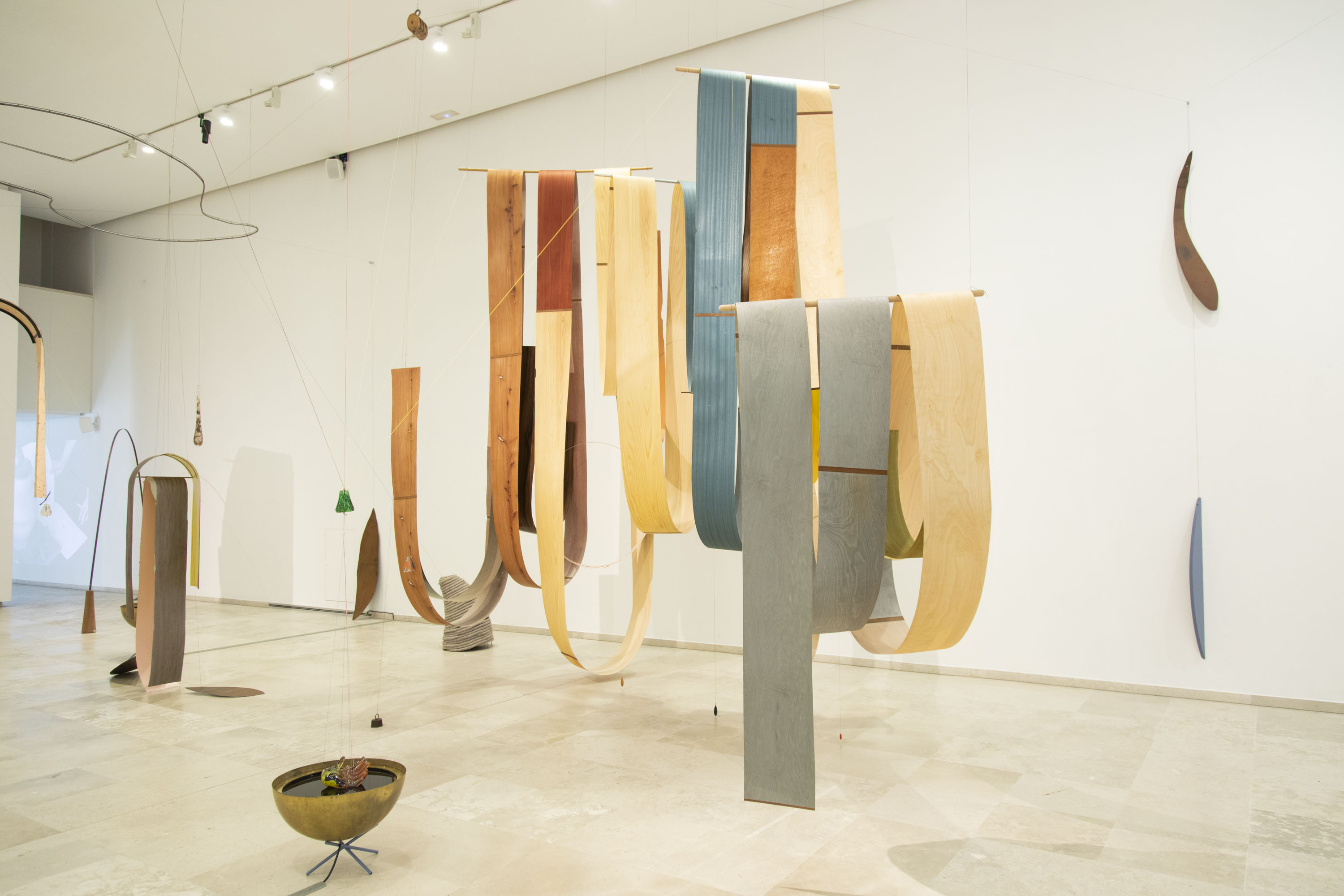 En las dos salas que flanquean el espacio principal, dos proyecciones funcionan como espejos, interconectados, en los que el lenguaje y el movimiento se abrazan, deslizando sentido el uno en el otro. Enfatizan la circularidad a la que aferran los sonidos y las formas, porque todo es consecuencia de algo y siempre hay un eslabón que conecte dos ideas, dos anhelos, dos temores. Caminamos entre las maderas, sinuosas y delicadas, y activamos, casi sin quererlo, el movimiento de unas manos de cristal que apelan a una tactilidad, a una fisicidad, que hoy se entienden como herramienta perceptiva de primer orden, porque no es noticia, ya lo sabemos, que los cuerpos han acabado con la supremacía de la mirada; se activan las manos y se nos invita a mirar a lo alto, y entendemos así el complejo mecanismo que hace posible el conjunto de la instalación, con las pequeñas roldanas repartiendo pesos y proyectando equilibrios. Suenan, sutiles, tintineos en latitudes lejanas, rumores que nacen de un mero roce (a veces ni siquiera hace falta contacto alguno para que estos sonidos se produzcan). Tirando líneas hallamos el origen de un movimiento en una pieza de cuerda que se yergue, lacónica, en una esquina, varada en una vibración lenta y sostenida.