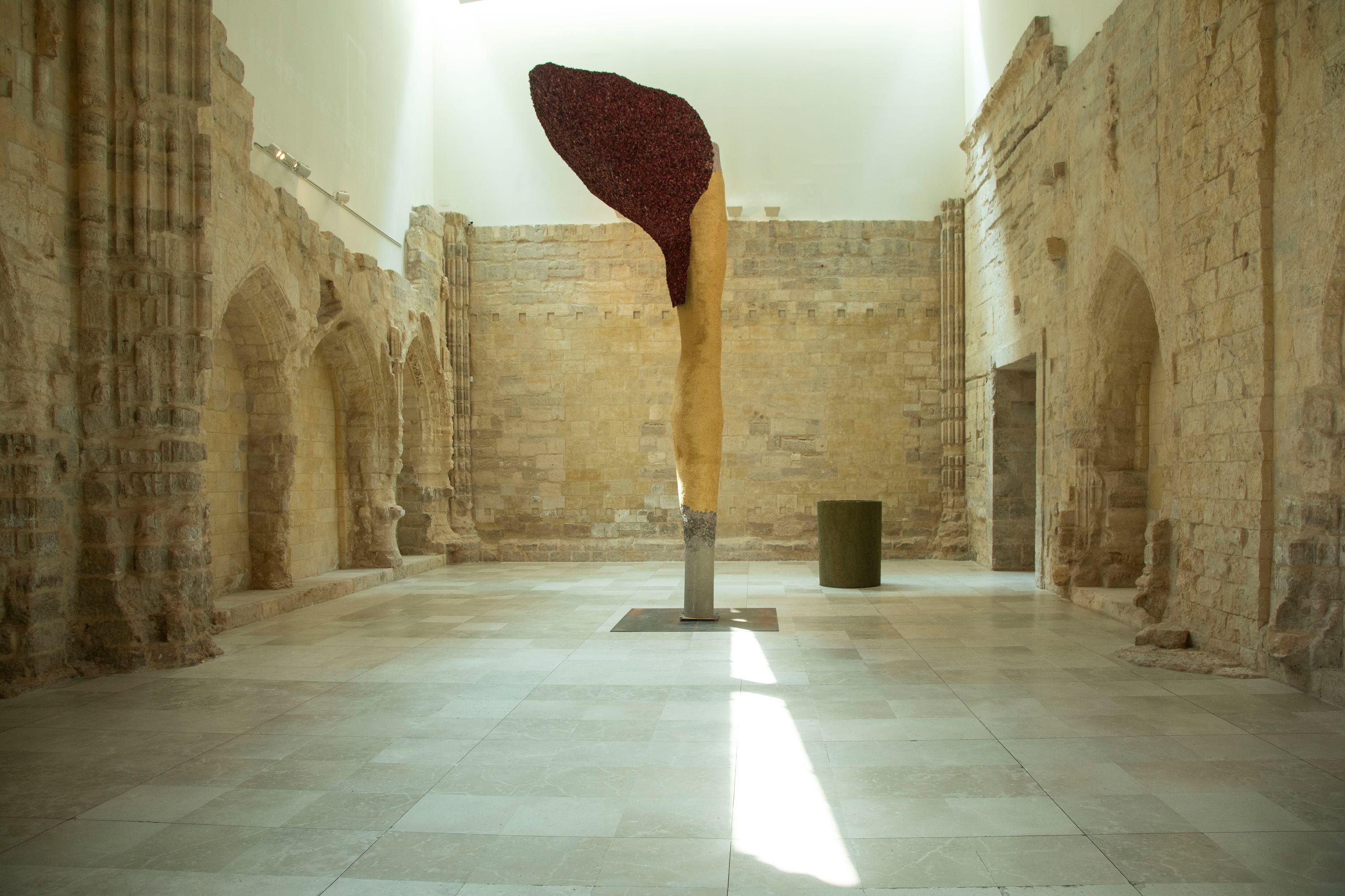 En Pajarazos David Bestué asume, de algún modo, el rol de un paisajista que trabaja desde la pulverización como estrategia para esquematizar el paisaje tanto desde su composición cromática como material. La muestra, que ocupa la Capilla y la Sala 9, se suma como propuesta específica del centro a reflexionar sobre la singularidad de los espacios históricos del Museo Patio Herreriano. La concepción y producción de las piezas de Pajarazos se encuentra atravesada por dos filtros: por un lado, la escultura policromada renacentista y barroca del Museo Nacional de Escultura de Valladolid y, por otro, la depuración descriptiva de la poesía de Olvido García Valdés cuando narra los rasgos del campo castellano. Bestué tritura una serie de objetos provenientes del paisaje vallisoletano hasta convertirlos en pigmentos, una metodología que puede entenderse como un proceso de depuración y síntesis de este mismo paisaje. A pesar de que, en muchos casos, trabaja desde la materia descompuesta, desde el objeto pulverizado y llevado al grado cero, la propuesta escultórica es de composición, propositiva. Este proceso, el de recurrir al paisaje como material, es el mismo que se encuentra en las esculturas del periodo renacentista y barroco presentes en el Museo Nacional de Escultura. Escultores como Alonso Berruguete, por ejemplo, utilizaban materiales como la madera de pino, la cola de conejo o el aceite de linaza, entre otros, para llevar a cabo sus esculturas. Esta descripción material y esquemática que podemos realizar de sus esculturas —más allá del significado iconográfico de las imágenes representadas— bien podría corresponder a una descripción material y cromática del propio territorio.
