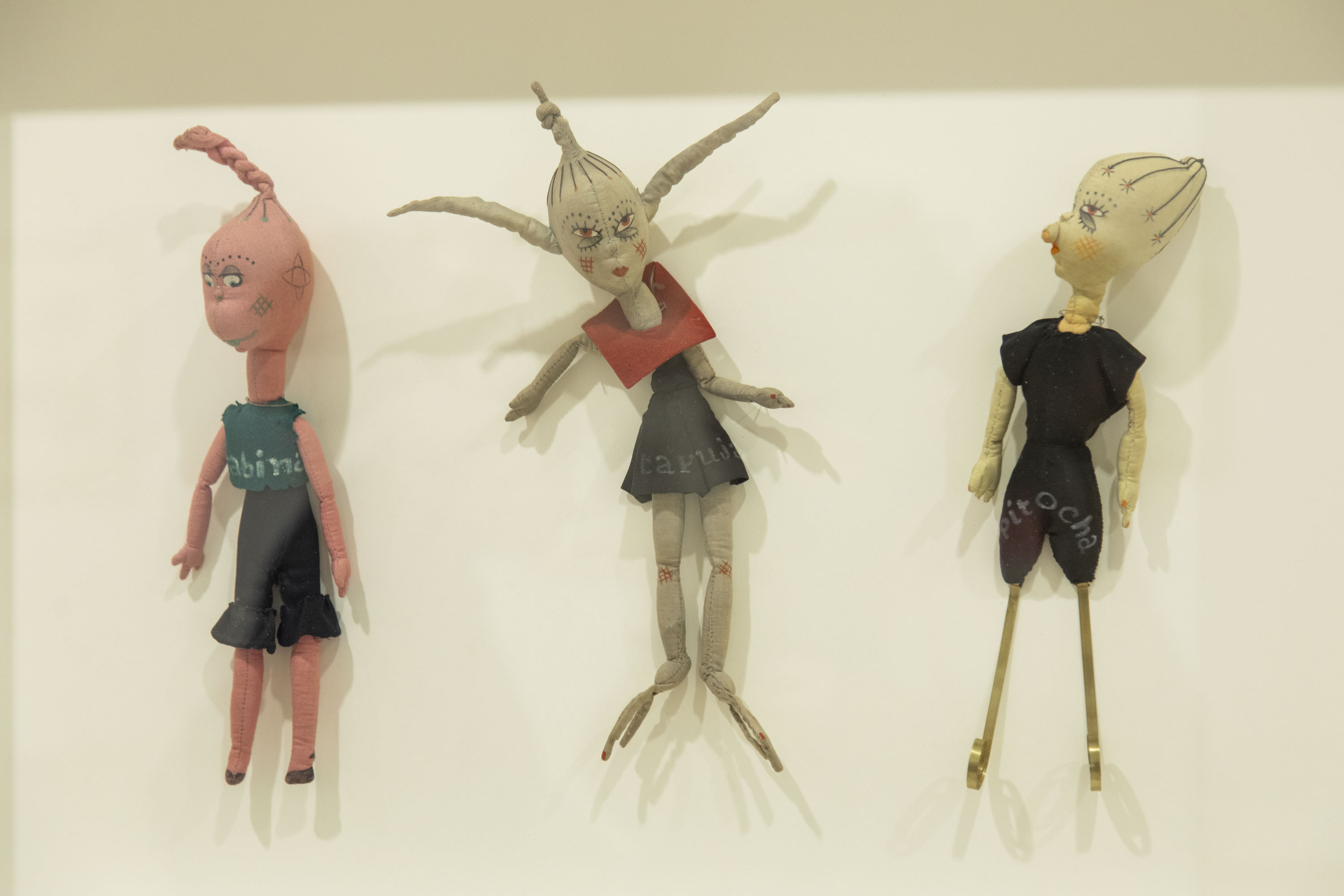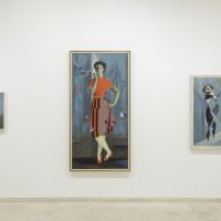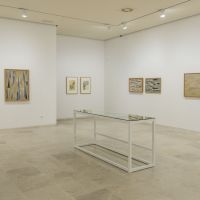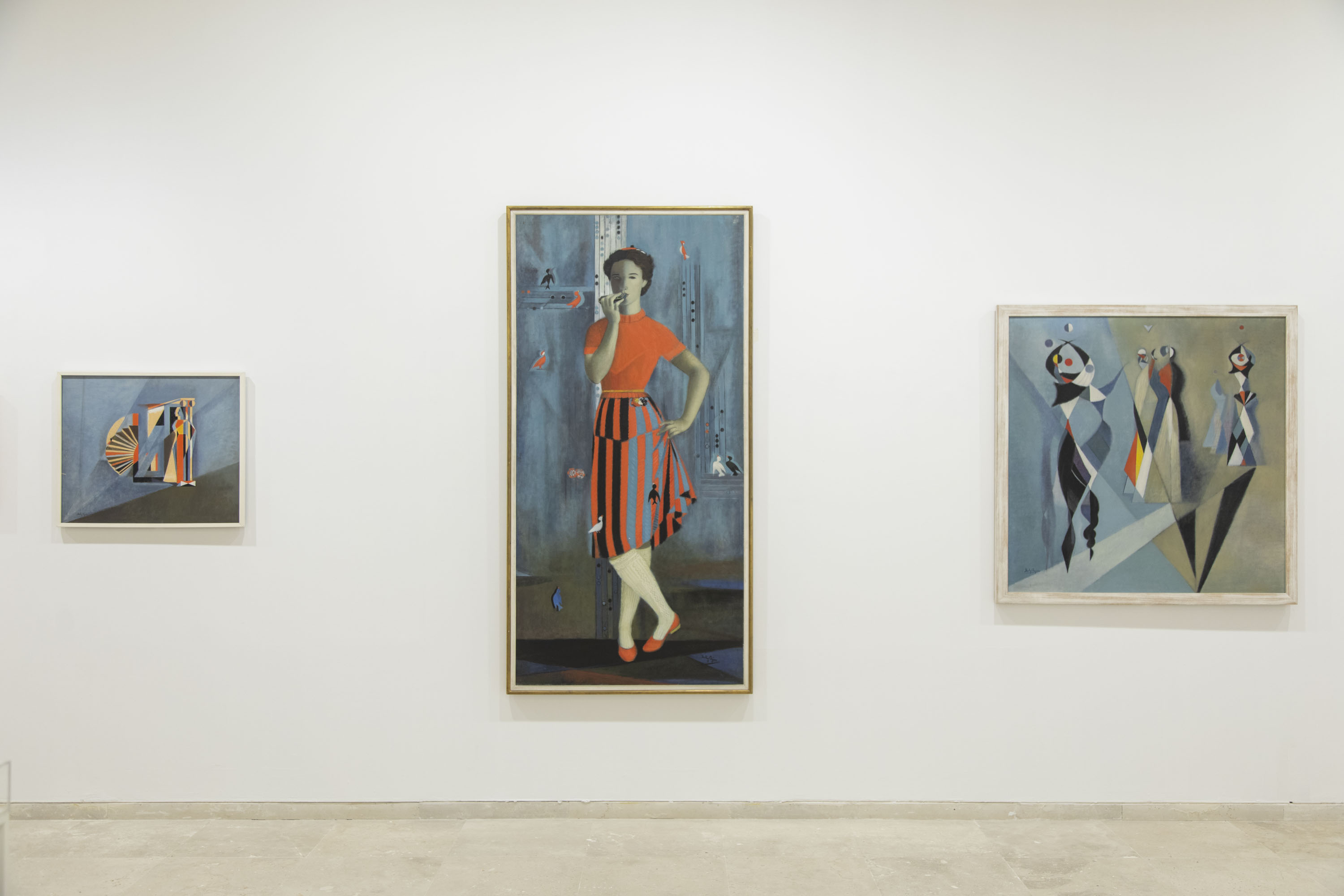 Las dos salas de la exposición marcan una división aproximada entre la obra de preguerra y la de posguerra. Los años cincuenta marcan una clara nueva dirección, pues Delhy avanza hacia la abstracción tras un primer momento que tiene como protagonista la figura humana en el que ahonda en la fusión entre figuras que dan como resultado obras de gran singularidad. De la parte final de su vida son sus trabajos para murales de grandes formatos en diferentes contextos. Se mostrarán aquà notables ejemplos de trabajos preparatorios.