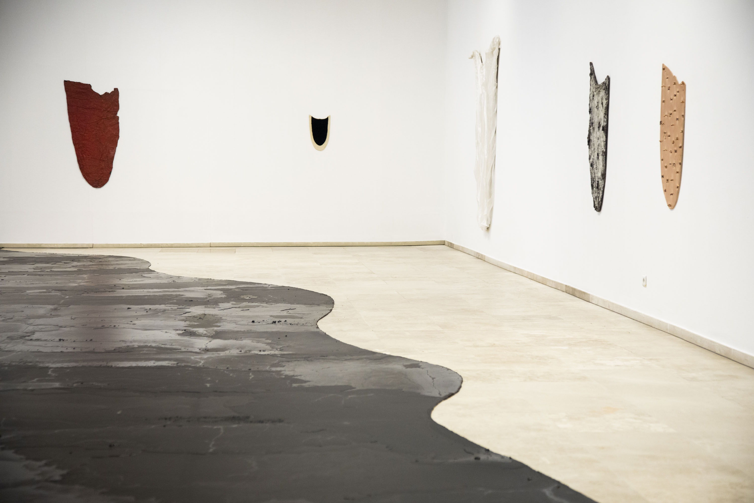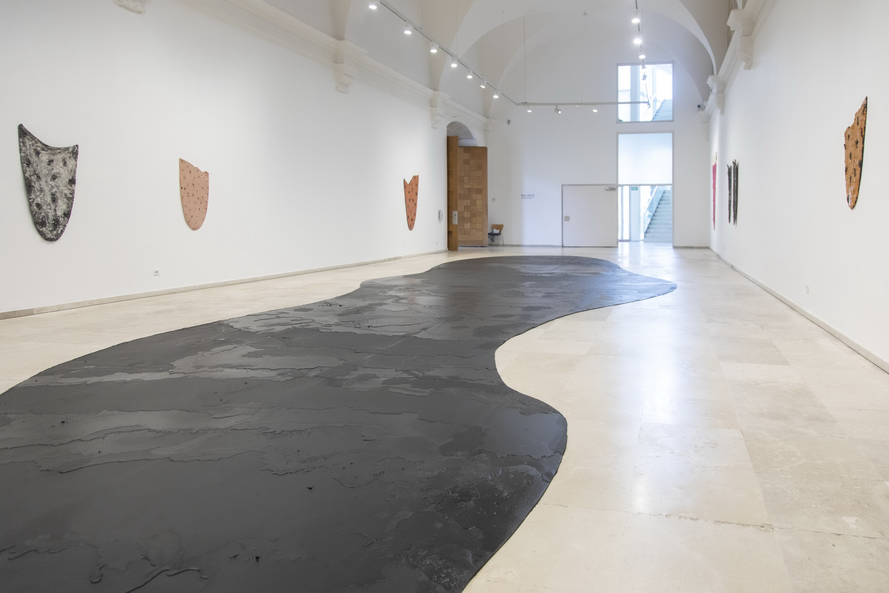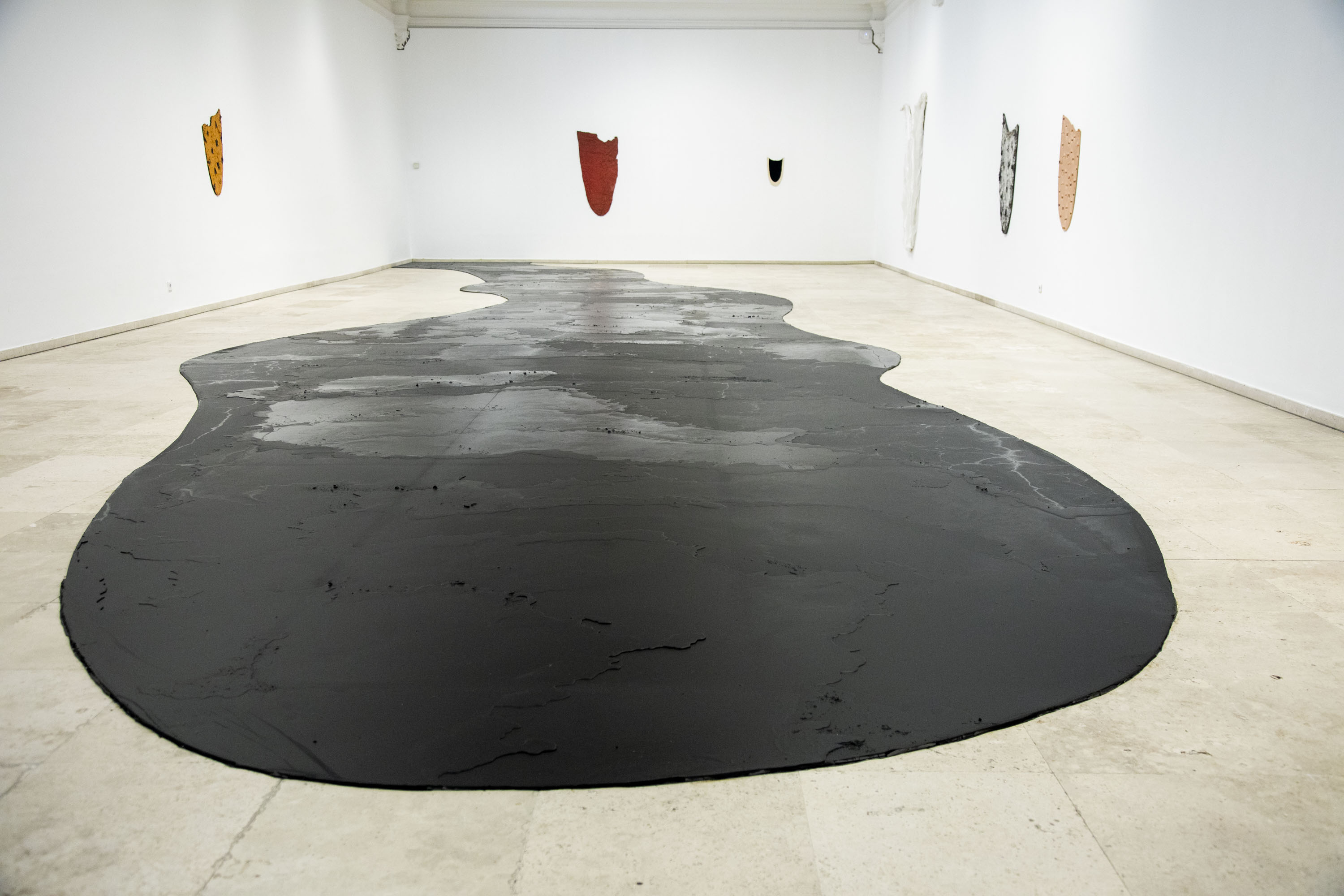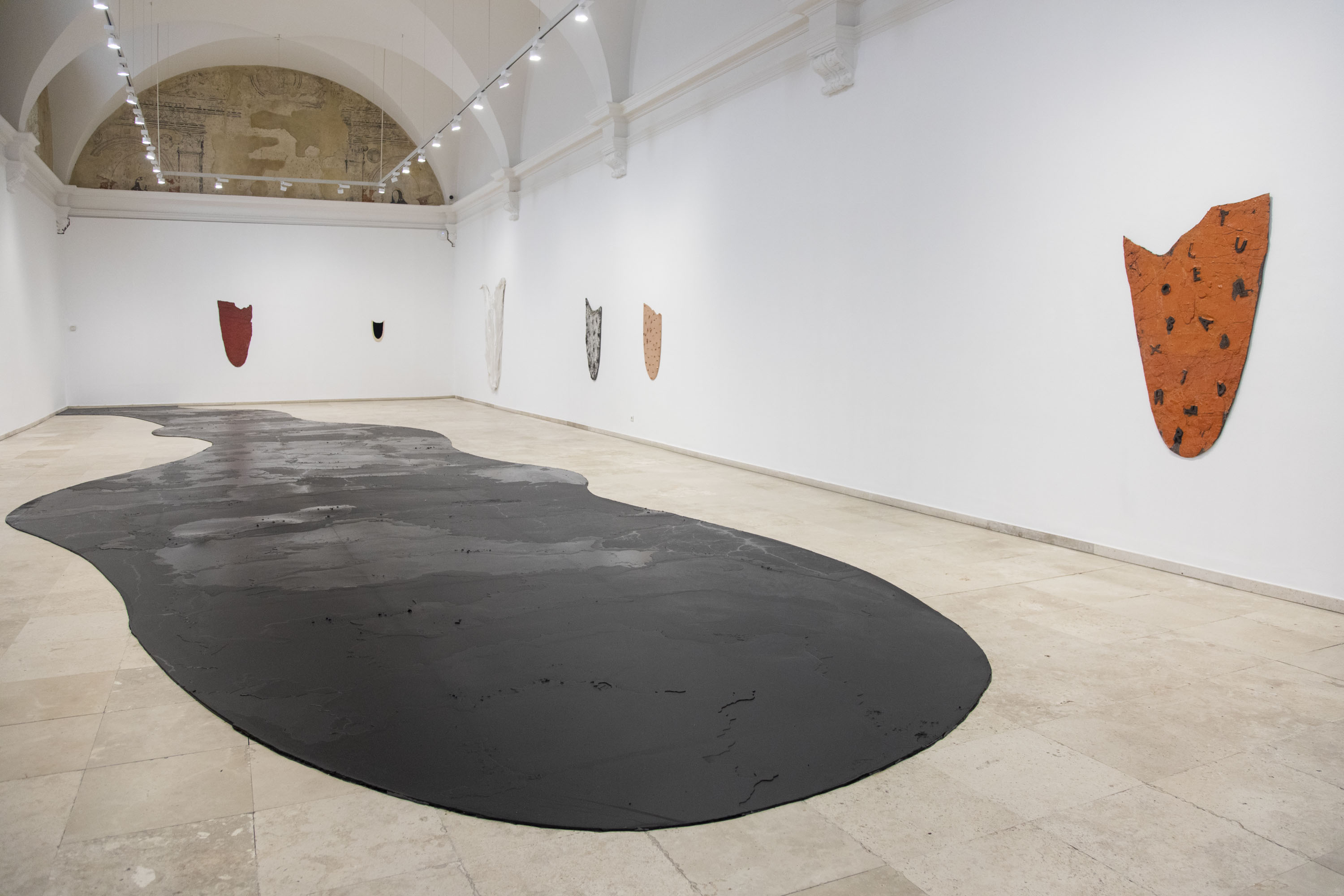 In Room 9 a huge black tongue with a dense texture covers the floor of the space and introduces a striking colour change with the white walls of the room. It is made of a historically relevant material in the area – pitch, also known as tar – and produces a sensation of ambivalence. It is magnetic, but there is also something in it that generates distance. Around it, some pieces from the “Tongues” series populate the perimeter of the room.