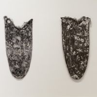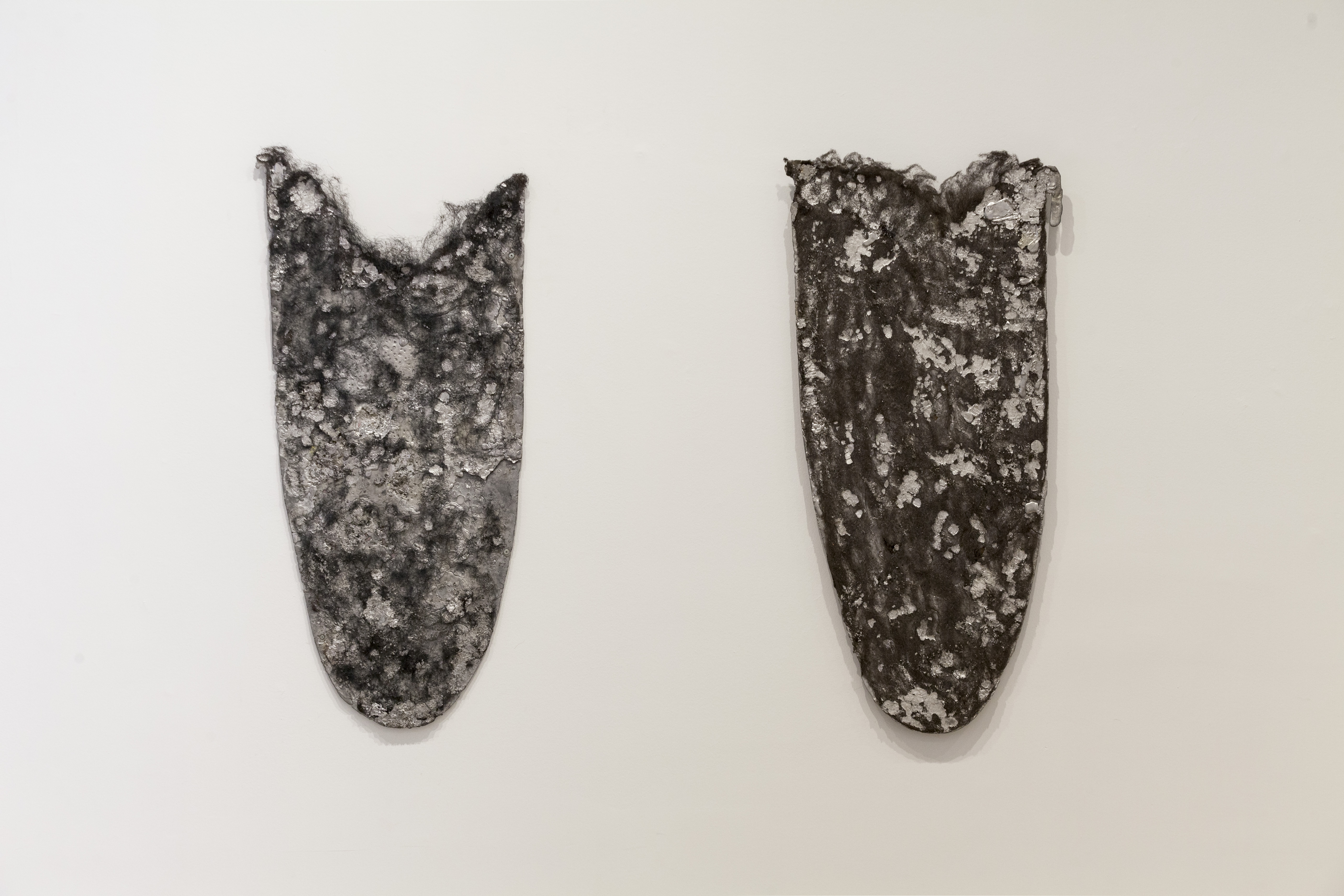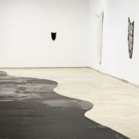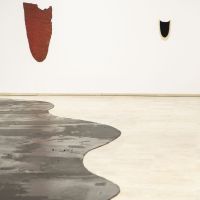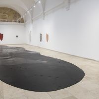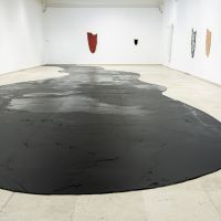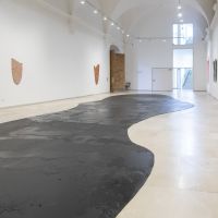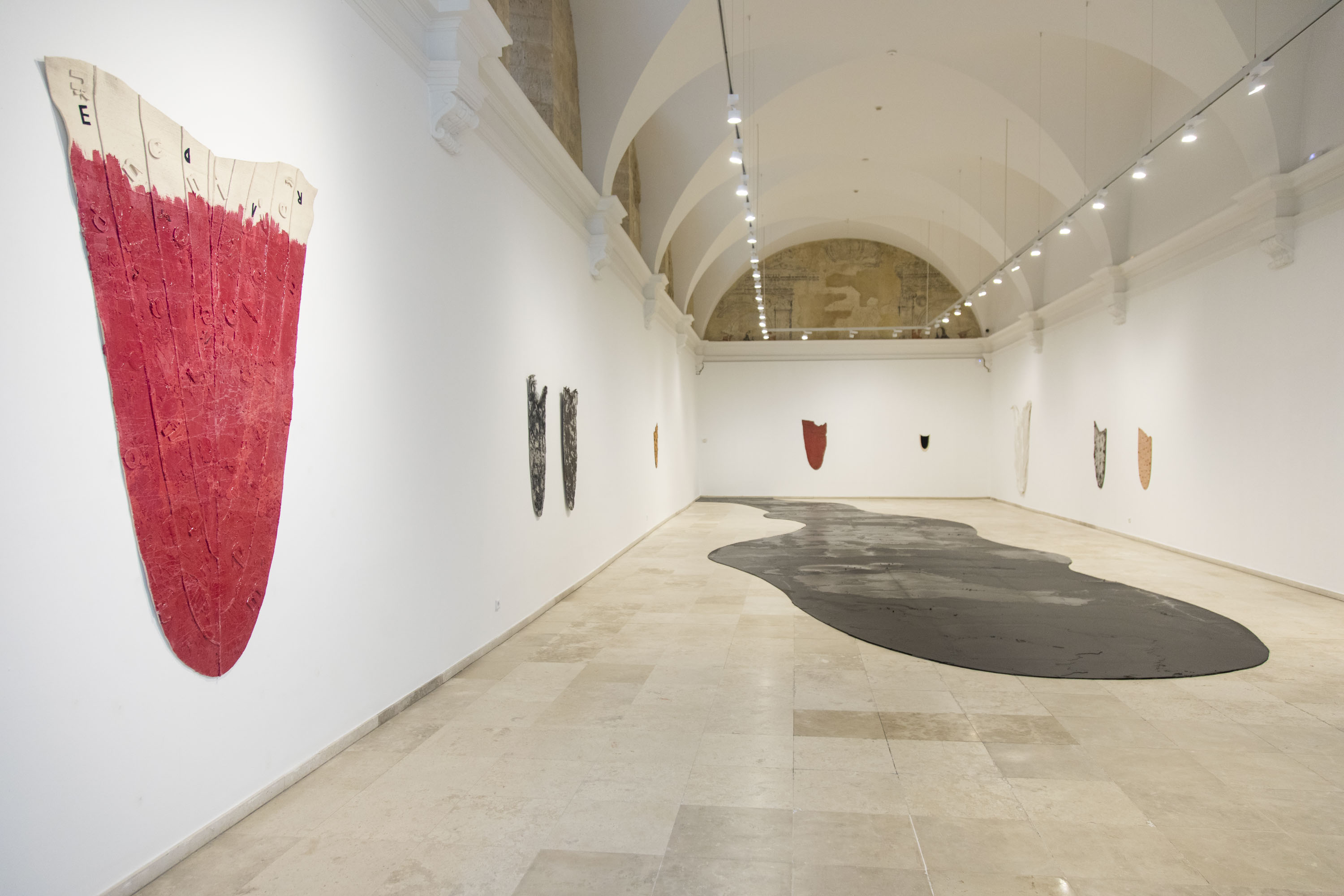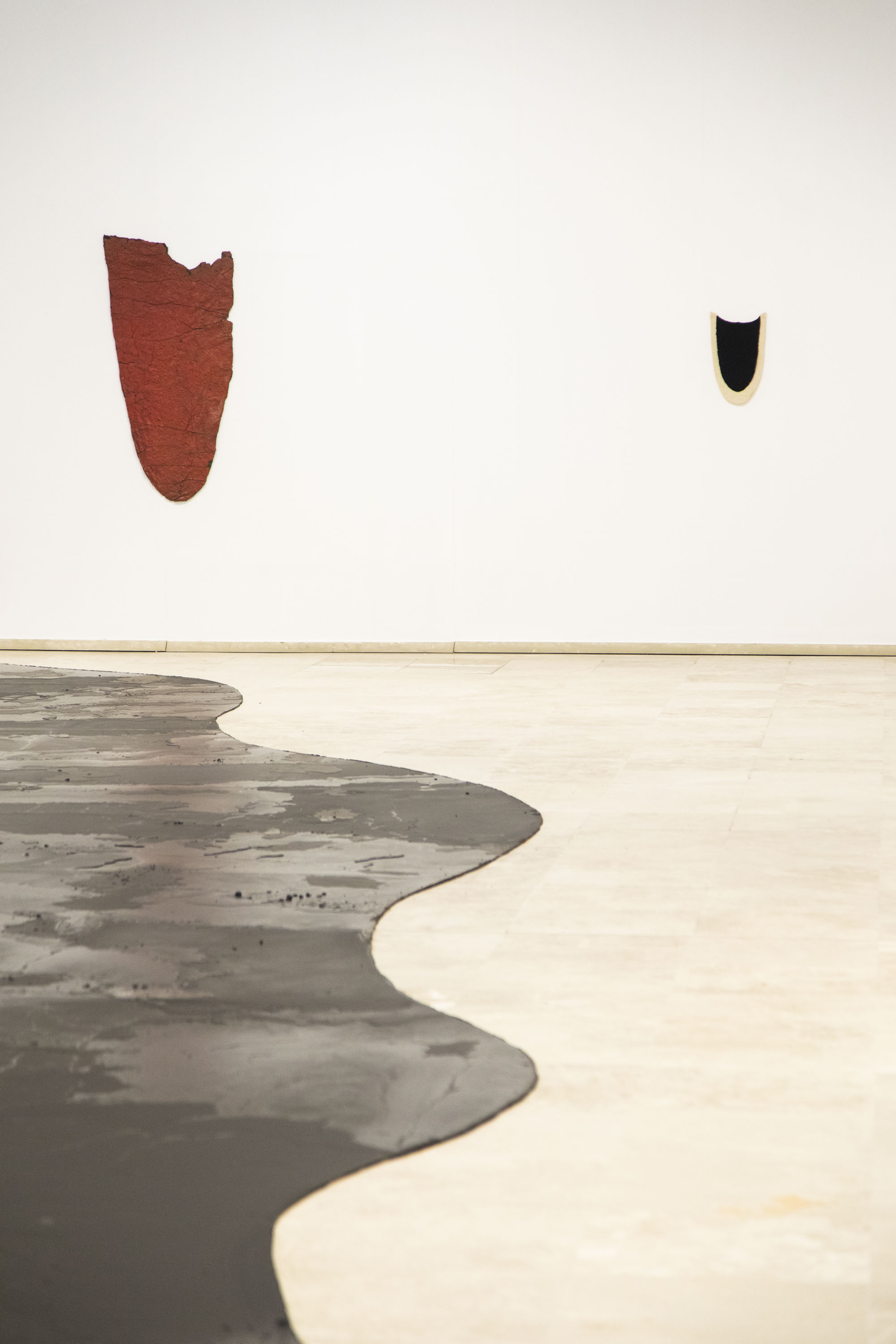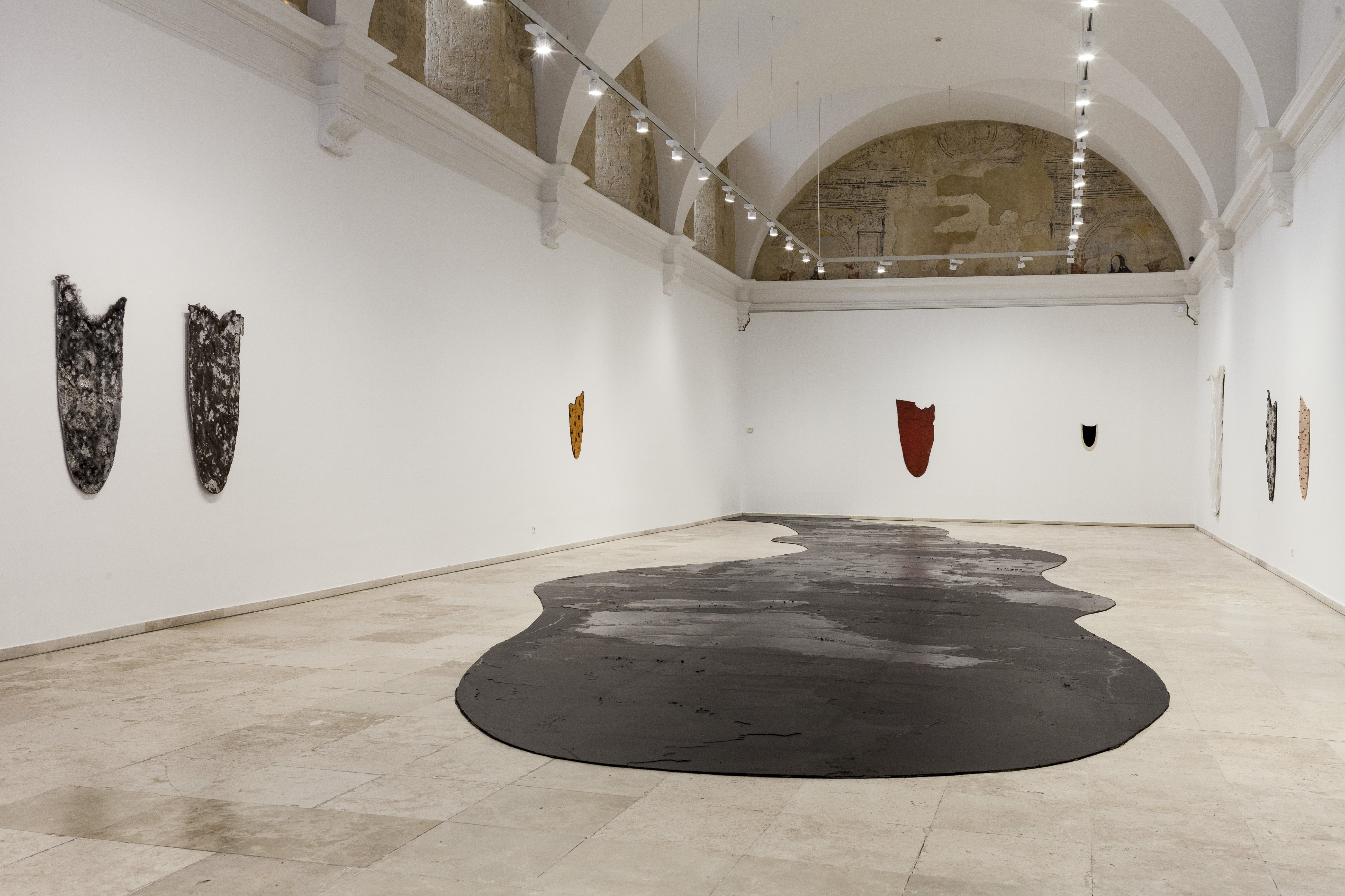 In Room 9 a huge black tongue with a dense texture covers the floor of the space and introduces a striking colour change with the white walls of the room. It is made of a historically relevant material in the area – pitch, also known as tar – and produces a sensation of ambivalence. It is magnetic, but there is also something in it that generates distance. Around it, some pieces from the “Tongues” series populate the perimeter of the room.
