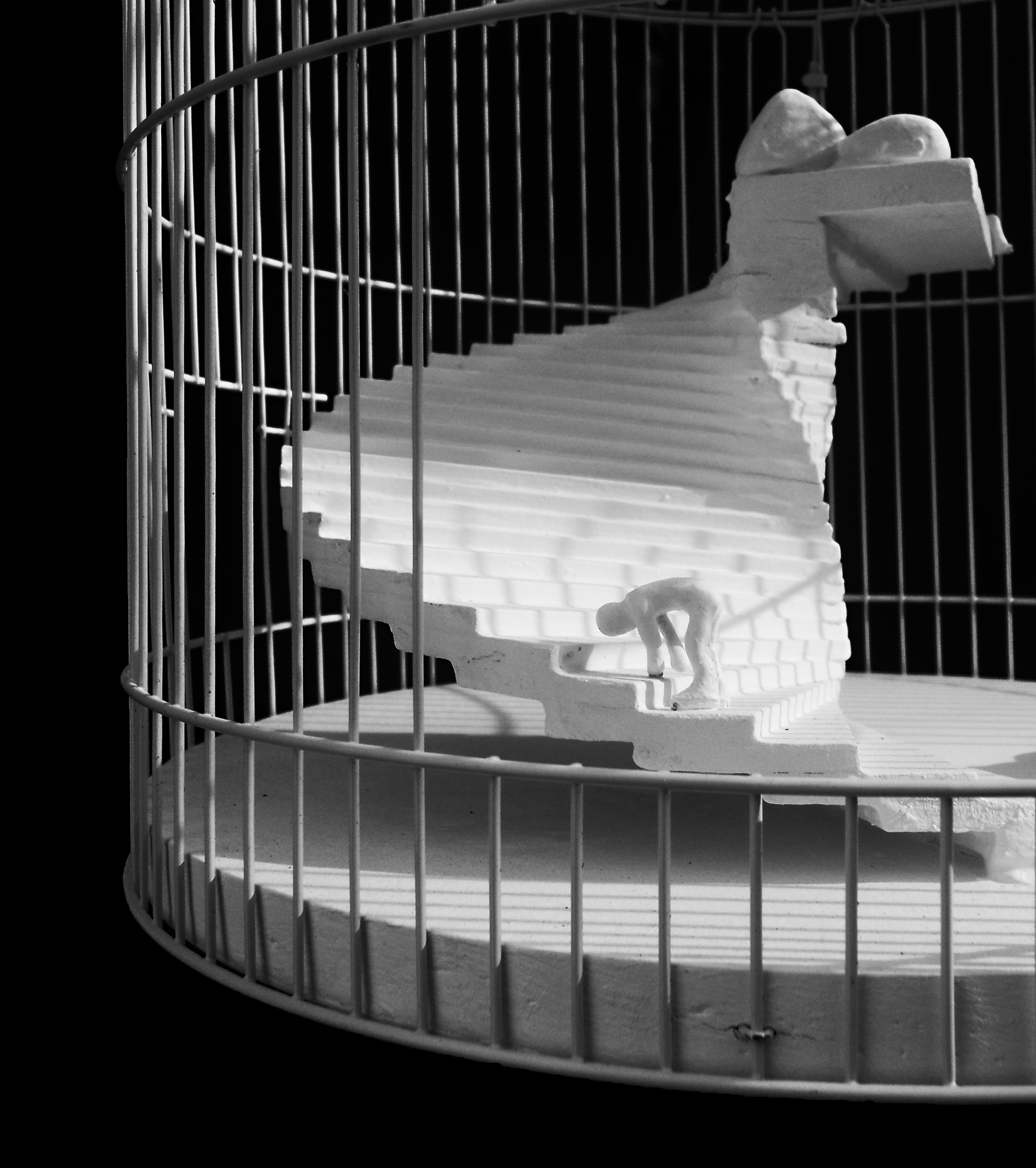 La instalación que presenta, “Una jaula salió en busca de un pájaro”, está dedicada al universo literario de Kafka, plagado de seres con dificultad de comunicación, entornos hostiles o extraños y escenas enjauladas de compleja definición.