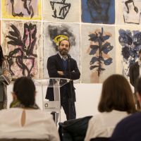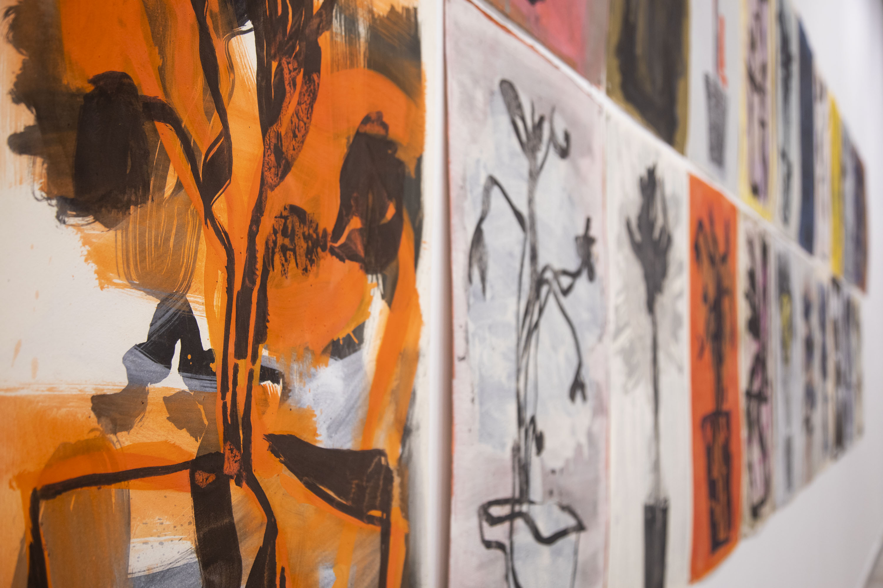 Un silencio y una quietud con una consecuencia, el tiempo llegar pertenecerle, él es quien le va marcando con sus obras y en el modo de elegir los momentos de sus pinturas, el tiempo de los objetos que pinta les señala su trabajo, sus series, sus decenas de papeles y telas convertidas en el sustento de su narración, en las palabras de ese discurso suyo. No pinta tiestos, ni chozos, ni rostros, ni hojas, en plural, sino que atrapa en su pintura uno solo de estos objetos en cada una de sus series, como en la más celebrada, la de sus tiestos, se apodera de una planta cogida en un tiesto y dentro de un tiempo propio credo para ella. Tiempo que se va a poder volver a secuenciar en la visita de esta exposición que acogen y abrazan dos instituciones, el Patio Herreriano y el Museo de la Universidad de Valladolid.