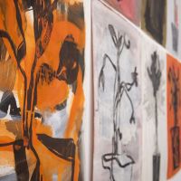 La exposición está concebida como un conjunto de temas a los que García Prieto se acercó con una reiteración casi obsesiva. Para el Patio Herreriano se ha seleccionado un número importante de papeles de un mismo formato y, por lo general, de un mismo grosor, algo que nos es baladí, pues tendía a verter grandes capas de pintura sobre el soporte, siempre sobre una base horizontal, así pintaba él. Se acercó a tan variados asuntos desde perspectivas múltiples, aunque los mirara siempre desde un mismo punto. Eso es, creemos, lo que implica ser artista: la capacidad de estar dándole vueltas y más vueltas a una misma idea, de buscarle siempre el envés a las cosas. Hemos seleccionado tiestos y más tiestos, hojas y hojas, raros rostros, bosques que dibujaba en continuidad como una misma obra y chozos tras chozos, unos tras otros pertinazmente… Hemos querido constatar cómo pueden verse mil caras en una sola, siempre desde una radical frontalidad. Por otro, en la sala del MUVa se han seleccionado sus trabajos, también obsesivos, sobre chozos, cabañas de piedra, refugio para pastores. Lo que fuera su aportación en la última muestra y el origen del proyecto con el Museo de la Universidad durante el último año. También se acogen sus obras sobre tela con los mismos temas que en sus series: hojas, flores, cabañas, bosques, rostros de mirada y extraños gestos. Obras de más tamaño en las que concentraba algunos de sus obsesiones también con óleo como el papel, en este caso sobre tela, magnificadas en su tamaño ya aturdido de sus obsesiones plásticas. Como puntos de atención de sus trabajos de series….