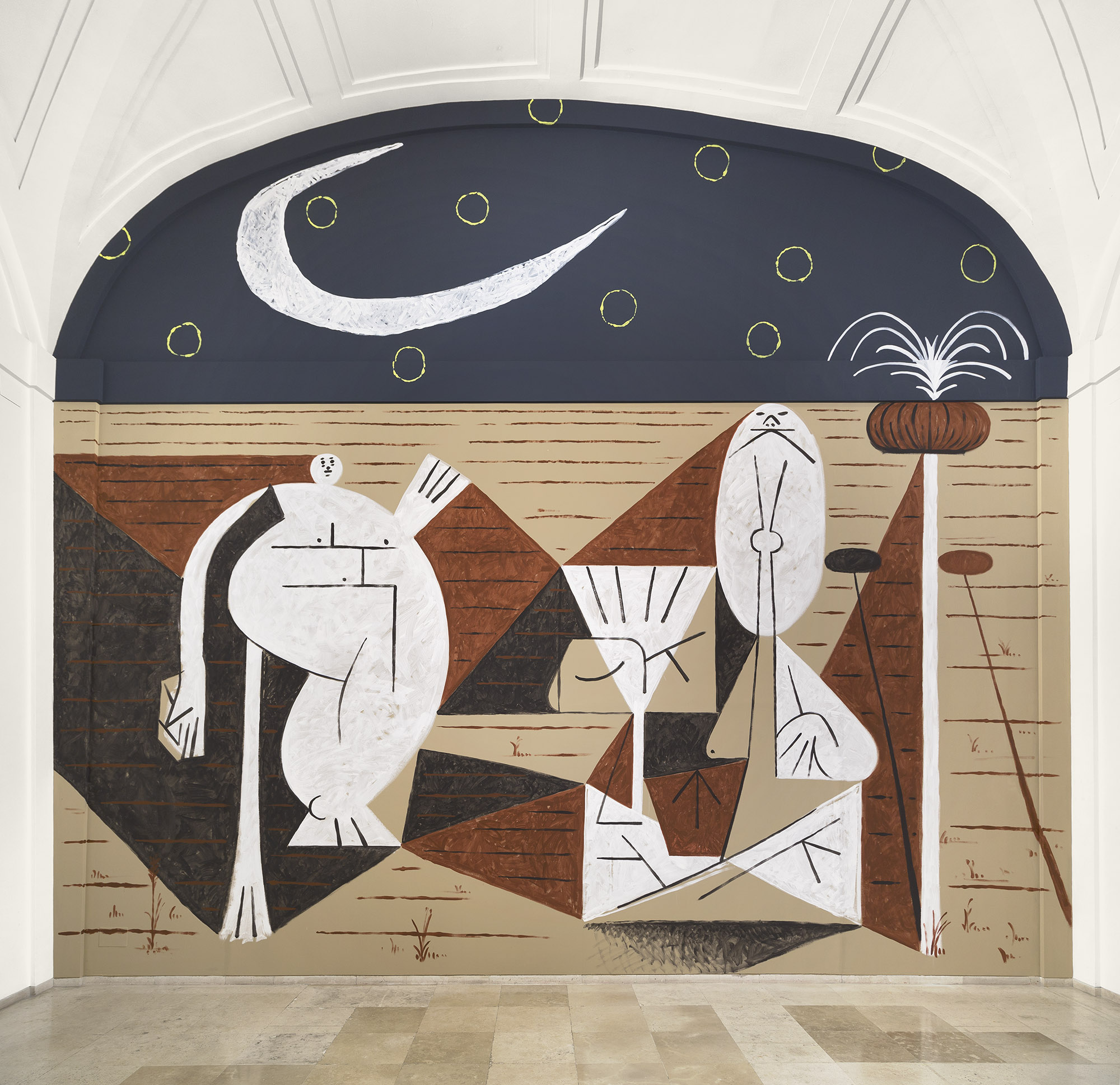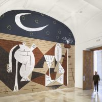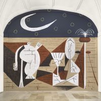 En el mural se puede ver un desierto y unas figuras que ofrecen su baile a la luna y las estrellas. La composición la cierra una palmera y su sombra. La escena se encuentra detenida en el tiempo, igual que en una llanura de Buzzati, pero cuidado, en esta llanura (la que nos ocupa) no hay ansiedad ni hastío, solo celebración. El tiempo está detenido, sí, pero esta suspensión habla de la memoria, habla de un recuerdo y de cómo lo percibimos, o mejor, como lo sentimos. Y ahora diréis —muy bien, pero ¿qué se recuerda? ¿qué se celebra?—. Pues bien, se celebra a Palencia, a Ferrant, a Alberto y también por supuesto a Picasso, a Klee y a Hepworth.