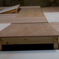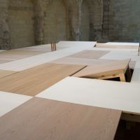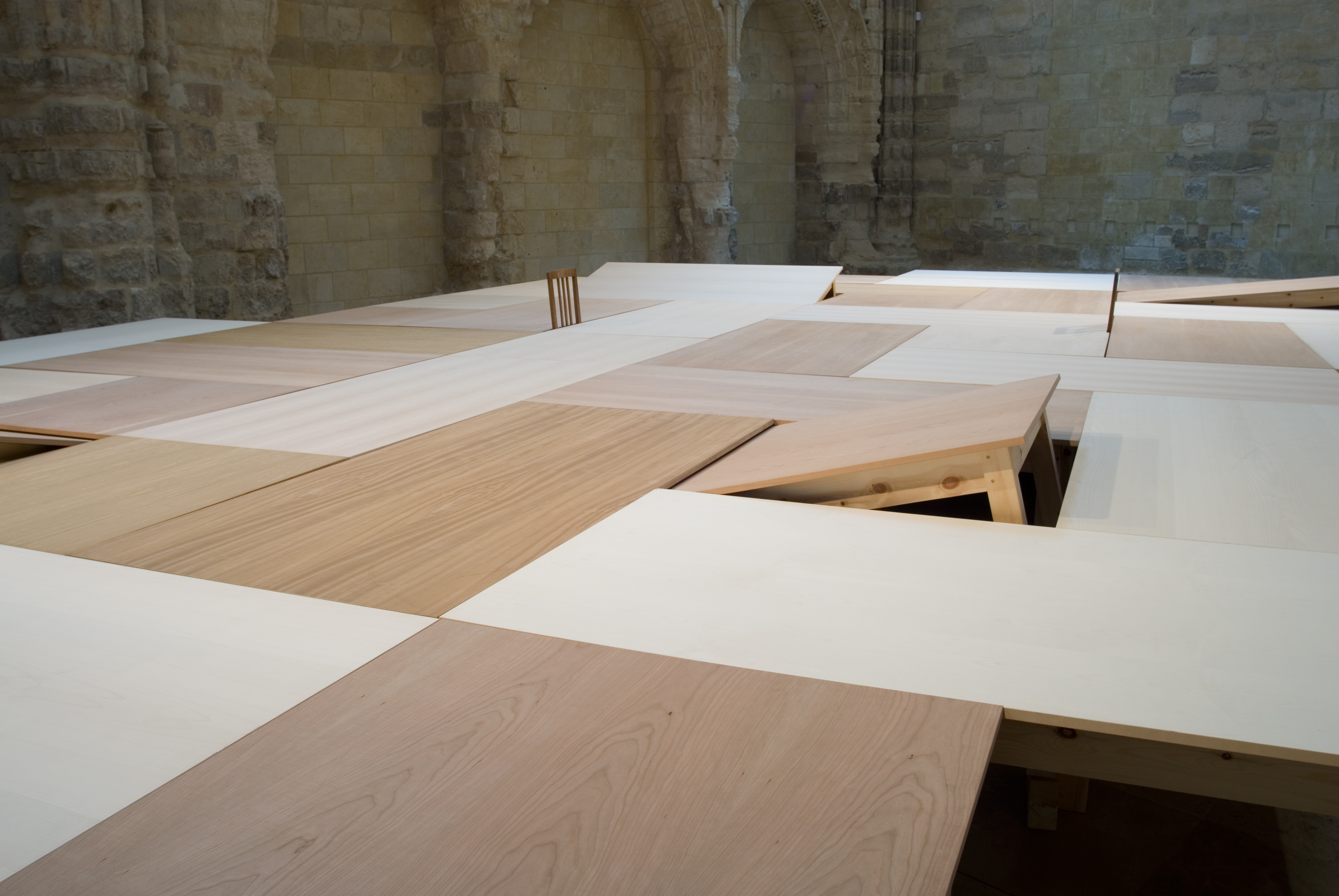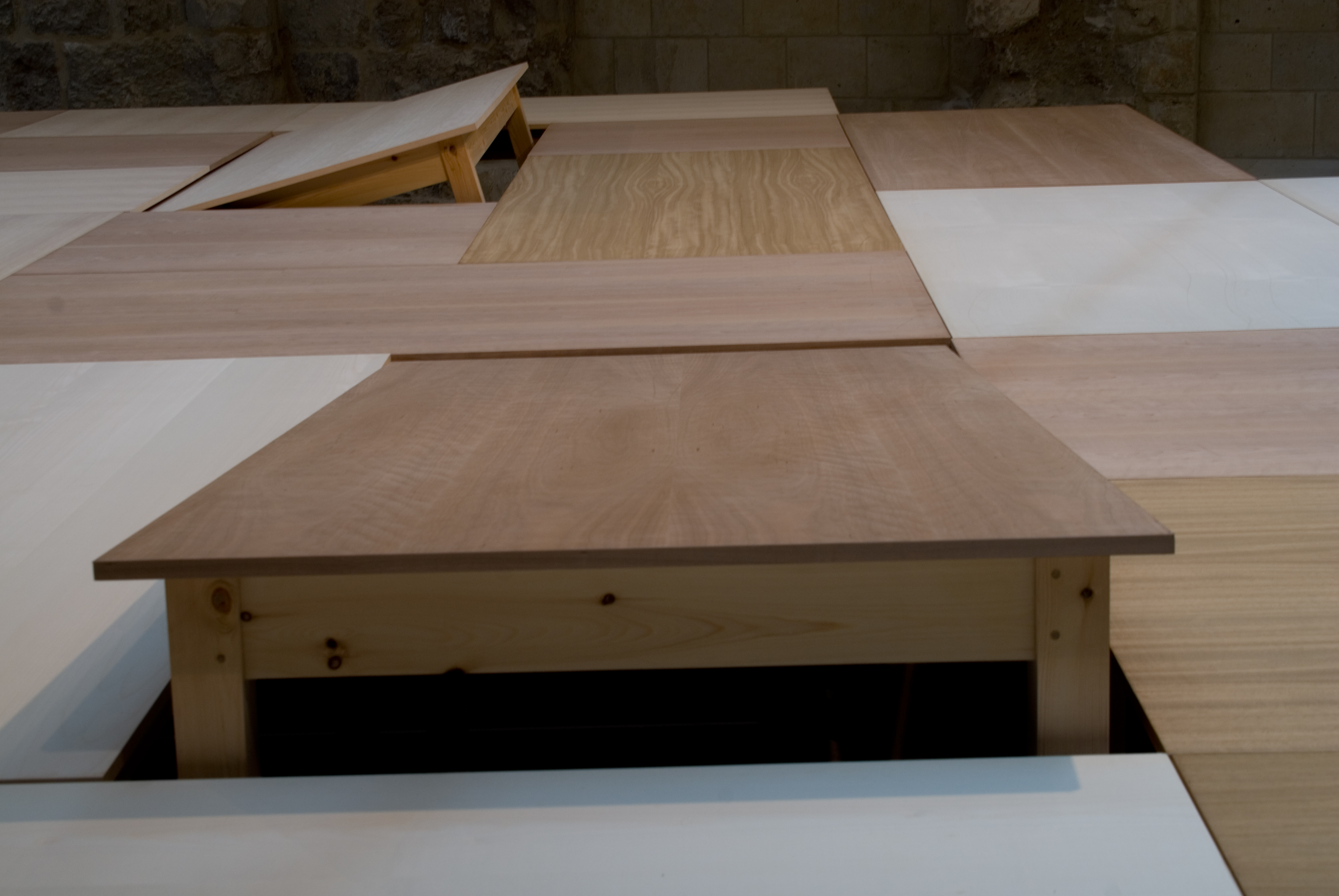 La obra utiliza piezas del mobiliario doméstico para producir una experiéncia escultorica e instalativa. Es natural reconocer que los objetos familiares que ocupan una vivienda, colchones, bancos y mesas (elementos habituales en el trabajo escultórico de Bechara), son piezas que contienen formas geométricas o geometrizantes. OK, OK Let´s Talk está formada por unas 50 mesas de madera de comedor, dispuestas en riguroso orden generando un gran campo geométrico. Algunas de ellas están inclinadas produciendo dislocaciones inesperadas en este "paisaje estable". Como elemento central, encuentra un dialogo transversal entre dos sillas dispuestas una frente a la otra, distantes y encajadas entre las mesas, asfixiadas por la falta de espacio.