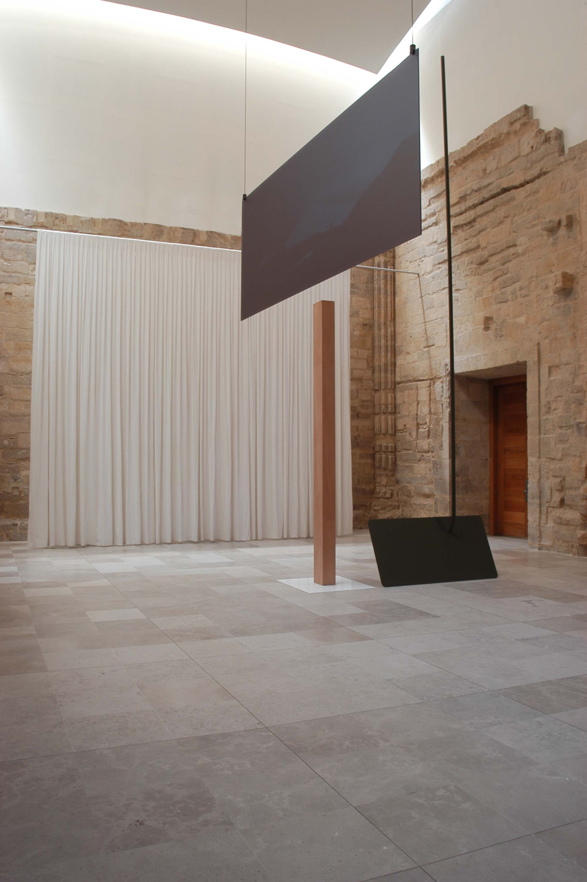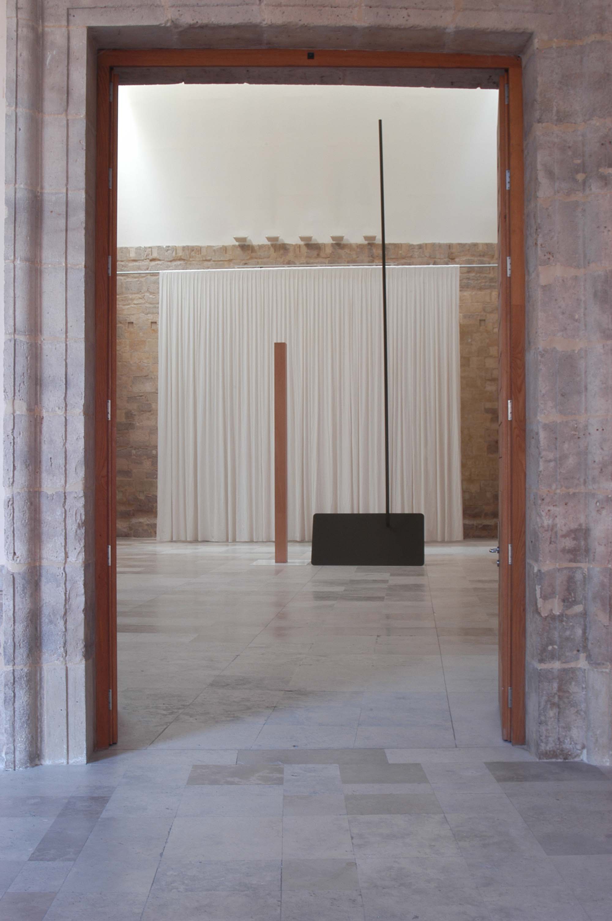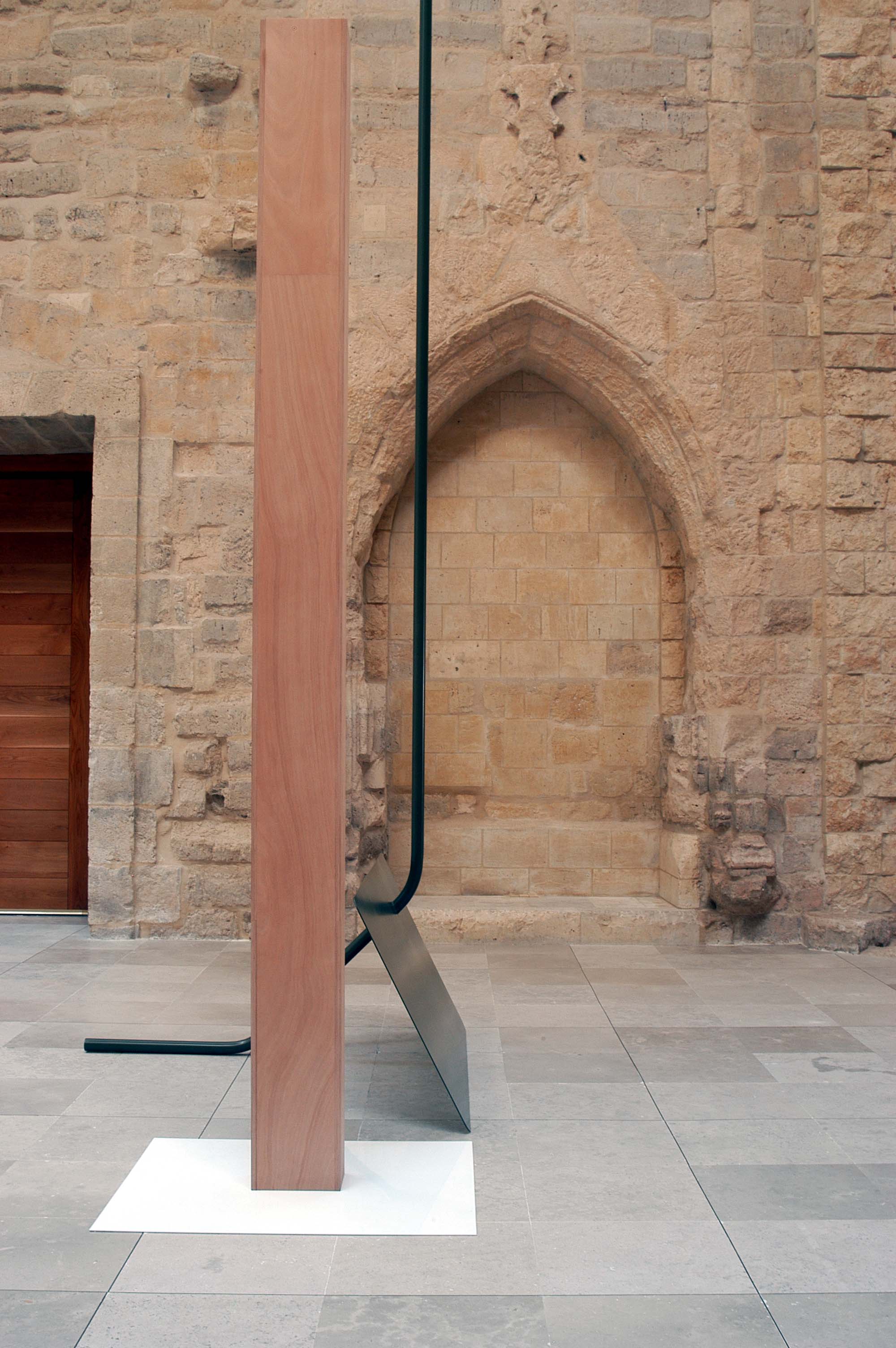 En el centro del espacio, dos estilizadas esculturas de madera y hierro se sostienen a sí mismas. Una parece brotar desde el subsuelo, como un tallo que emerge pilar de cálida madera. La otra, una pértiga de limpia factura, atraviesa un plano inclinado que la mantiene en equilibrio. En su depurada, súbita y silenciosa abstracción constructivista, ambas encierran la esencia del insólito paisaje donde se hacen compañía una a la otra. Cual líneas de fuga, nada falta ni sobra en la poética sutil de estos etéreos elementos que, al desafiar la gravedad, entonan un sobrio y simbólico homenaje al trazo de su escalada en el espacio. Y, en especial, al arte, que nunca expresa nada que no sea a sí mismo, como decía Wilde.