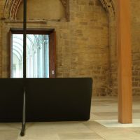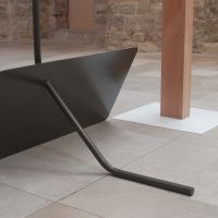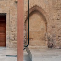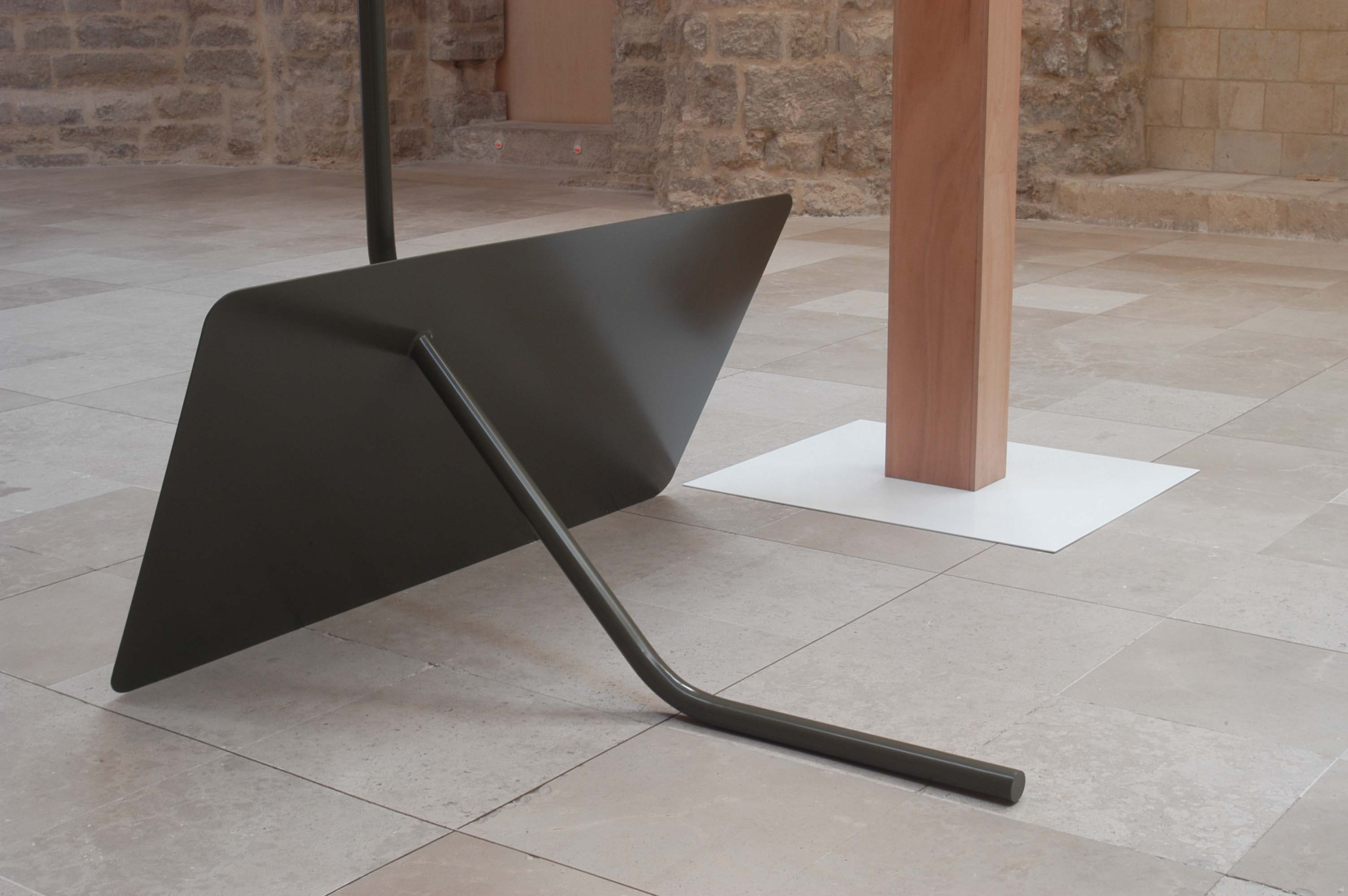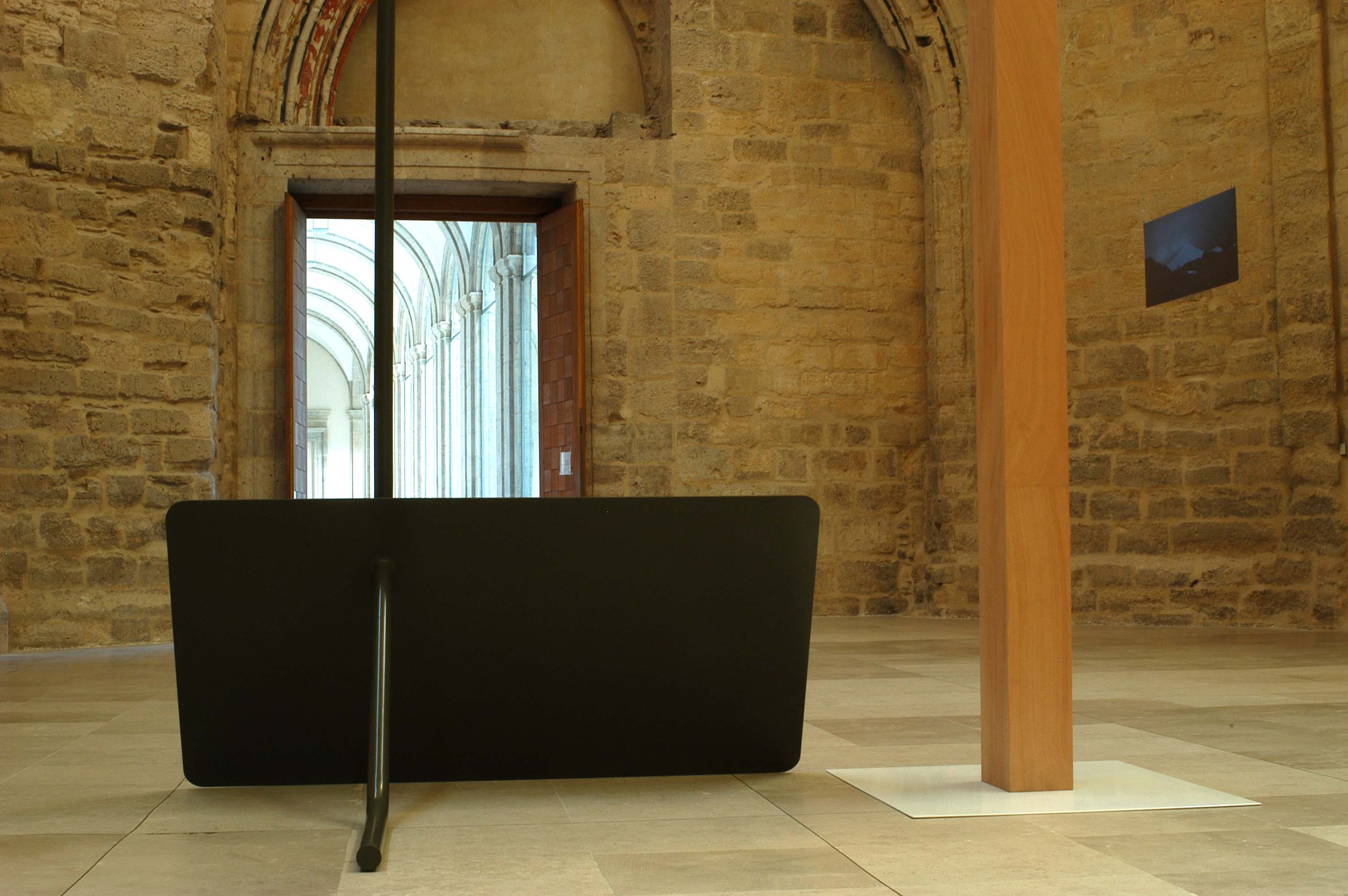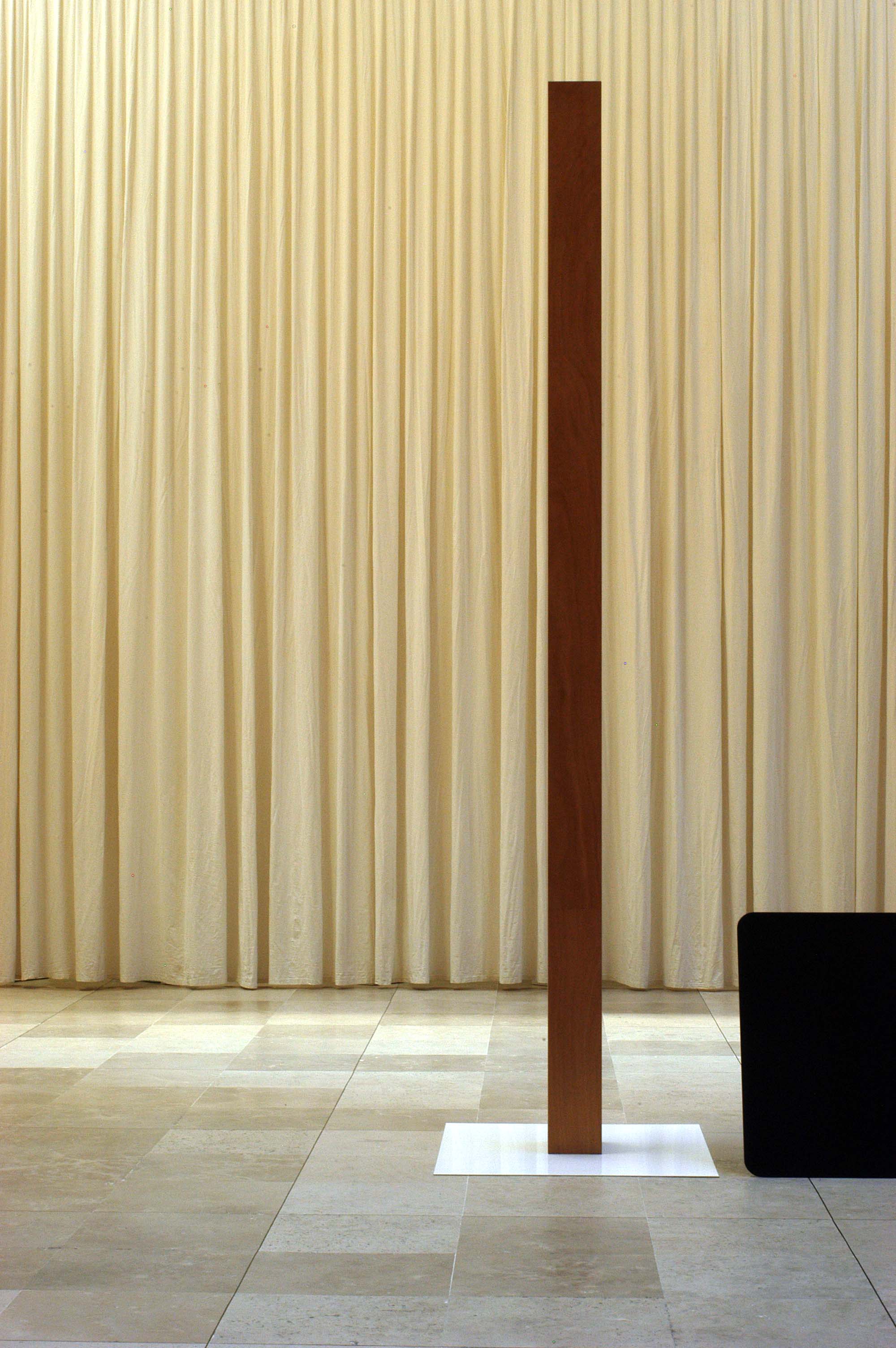 En el centro del espacio, dos estilizadas esculturas de madera y hierro se sostienen a sí mismas. Una parece brotar desde el subsuelo, como un tallo que emerge pilar de cálida madera. La otra, una pértiga de limpia factura, atraviesa un plano inclinado que la mantiene en equilibrio. En su depurada, súbita y silenciosa abstracción constructivista, ambas encierran la esencia del insólito paisaje donde se hacen compañía una a la otra. Cual líneas de fuga, nada falta ni sobra en la poética sutil de estos etéreos elementos que, al desafiar la gravedad, entonan un sobrio y simbólico homenaje al trazo de su escalada en el espacio. Y, en especial, al arte, que nunca expresa nada que no sea a sí mismo, como decía Wilde.
