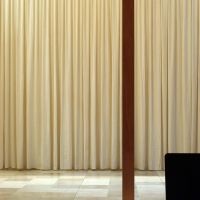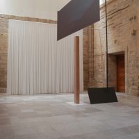 Al fondo, un telón se despliega en un gran plano estriado, incorporando la dimensión cinética a una suerte de marco arquitectónico, pictórico y teatral. Para el espectador, la referencia al teatro como lugar de la representación, establece una relación dialéctica entre la esperada apropiación discursiva de algo dado y la posibilidad de participar en una ficción. Este aspecto narrativo del telón, veladamente inducido por el vacío ondulante producido por el aire, reta la actitud contemplativa del espectador ante la obra, atrayéndole al centro de la escena. La inmediatez con que el visitante percibe el constante vaivén del telón invita a un ejercicio perceptivo interactivo que incorpora sus propios movimientos, desarticulando así cualquier esquema lógico. En tanto que hay algo no expresado, un margen blanco se abre para la sorpresa y también para esa obsolescencia propia del teatro asociada a la fugacidad de los momentos sin propósito. Esta zona expresiva está más allá del objeto visual que ha sido privado al espectador, así como de las convenciones de atribución de lo artístico y de su construcción, manteniendo, sin embargo, una ligadura viva con el mecanismo generador de sentido, en el más amplio sentido del término. El interés del artista en el medio, y en el modo en que éste inspira y condiciona la creatividad del público, apunta a esa movilidad y a la libertad física y mental que anticipa lo imposible del paisaje encontrado. Libertad a la que hace referencia Wilde cuando afirma que el arte que renuncia a su medio imaginativo renuncia a todo.