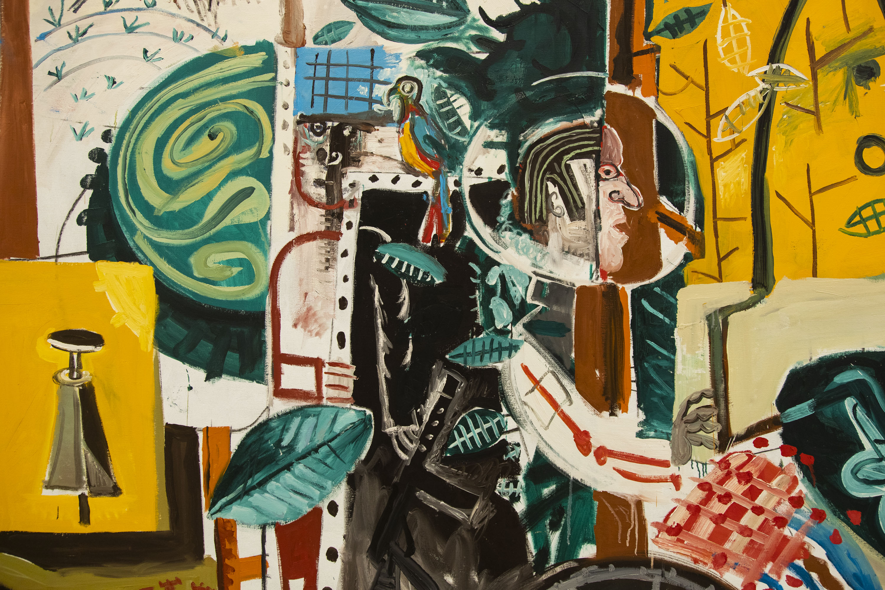 There is a thread that historically links Luis Gordillo to Abraham Lacalle and the latter to Miki Leal, thanks to both his trust in the act of painting, his critique of the image and a certain pointed irony present in all his work. Lacalle’s The Astronaut is dominated by a sarcastic humour and an understanding of the act of painting that admirably combines concept and application. The artist’s imaginary richness, the ubiquity of the images, the “literary” essence of his composition, the dispersion of the figures in a dissemination that responds to the dismemberment of the narrative and the intestine implosion of the picture due to its vibrant chromaticism, all stand out.