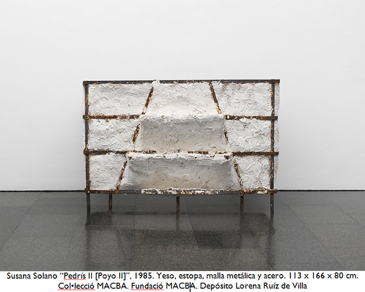 Pasado el pequeño muro que corta la sala en dos vemos otros tres trabajos de primera época, La Lluna nº 4, perteneciente a la Colección Arte Contemporáneo, y otros dos que vienen a dialogar con ella, ambos procedentes de Barcelona, Pedris, II, perteneciente a la colección del MACBA, y Deposit d’Ombra. Asistimos a un diálogo entre materiales antagónicos como la escayola y el acero, éste estructural, aquél epidérmico. La escayola es en estas obras una piel áspera y rugosa como las texturas de la antiforma, aquella estética que predominó en los años 60 y 70 y a cuya revisión se incorporó Solano en la década de los ochenta (la antiforma, como su contrario, el minimalismo, viene y va cíclicamente, como todas las modas). Se asomaría Solano a la obra de artistas como Eva Hesse, que desapareció muy joven, o de otros creadores como la fabulosa Marisa Merz, que acaba de morir, o su no menos atractivo compatriota Pier Paolo Calzolari. Las tres piezas tienen un “afuera” al que se les supone un “adentro”, algo de habitáculo y algo de objeto abstracto, la piel blanca y un negro enigma en el alma.