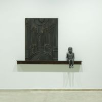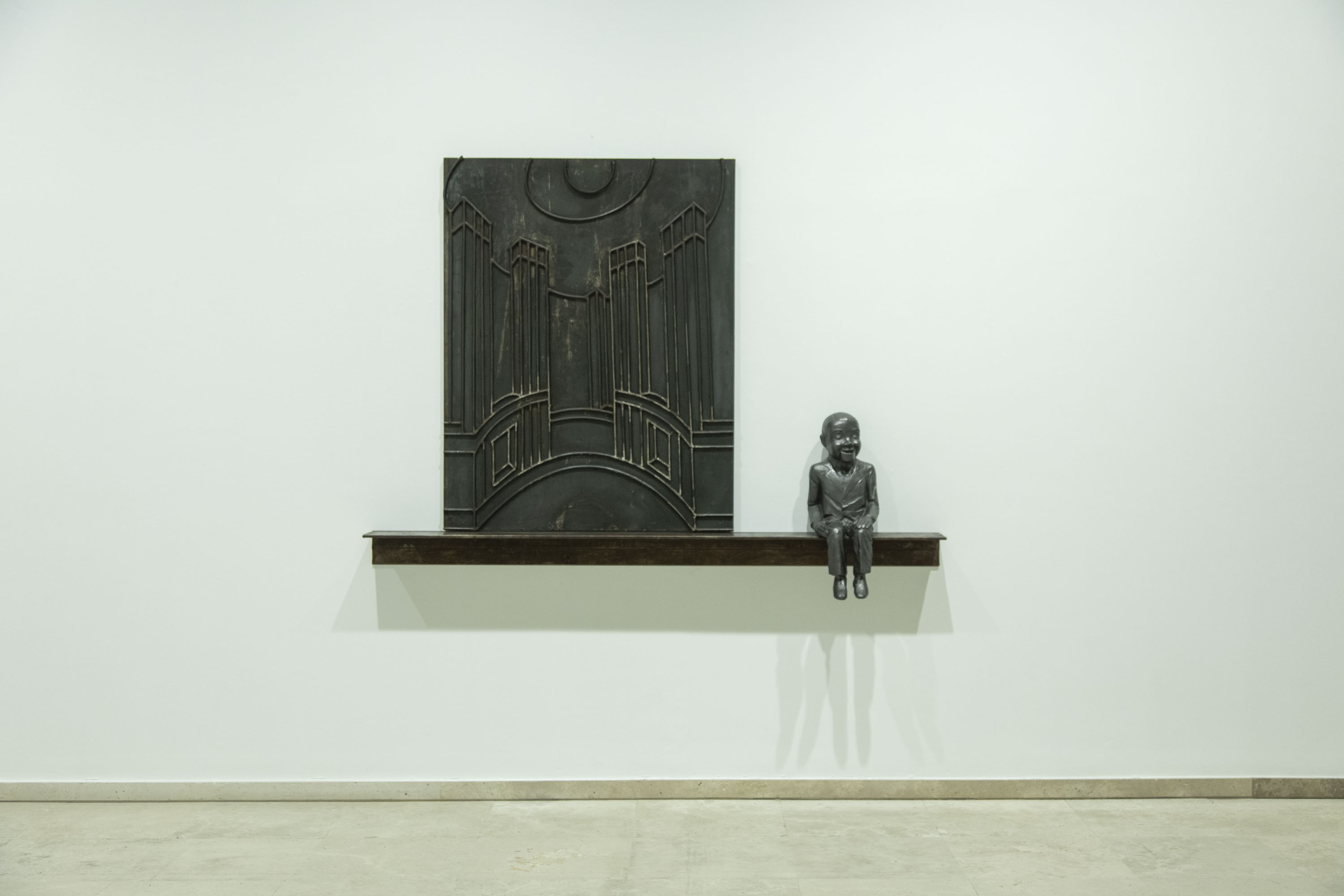 One of the purposes of this exhibition is to establish a dialogue among a group of works of art on loan from public institutions and private collections, in order to provide a reading of the artist’s work that addresses the central issues of his career within the framework of the museum’s unique architecture. Among these works of art is Piece Listening to the Wall , dating from 1992. It is a classic roly-poly toy made of bronze, belonging to the Contemporary Art Collection Association, listening to something we cannot identify. It is located in one of the museum’s cloisters, highlighting the relationship between work, space and viewer that Juan Muñoz tenaciously explored throughout his career. The exhibition is being held in the Chapel of the Counts of Fuensaldaña and in Room 9, both on the ground floor, and in Room 8 on the second floor. It also takes up other common areas of the museum.