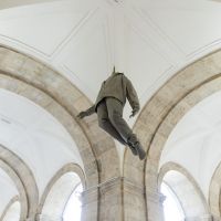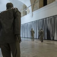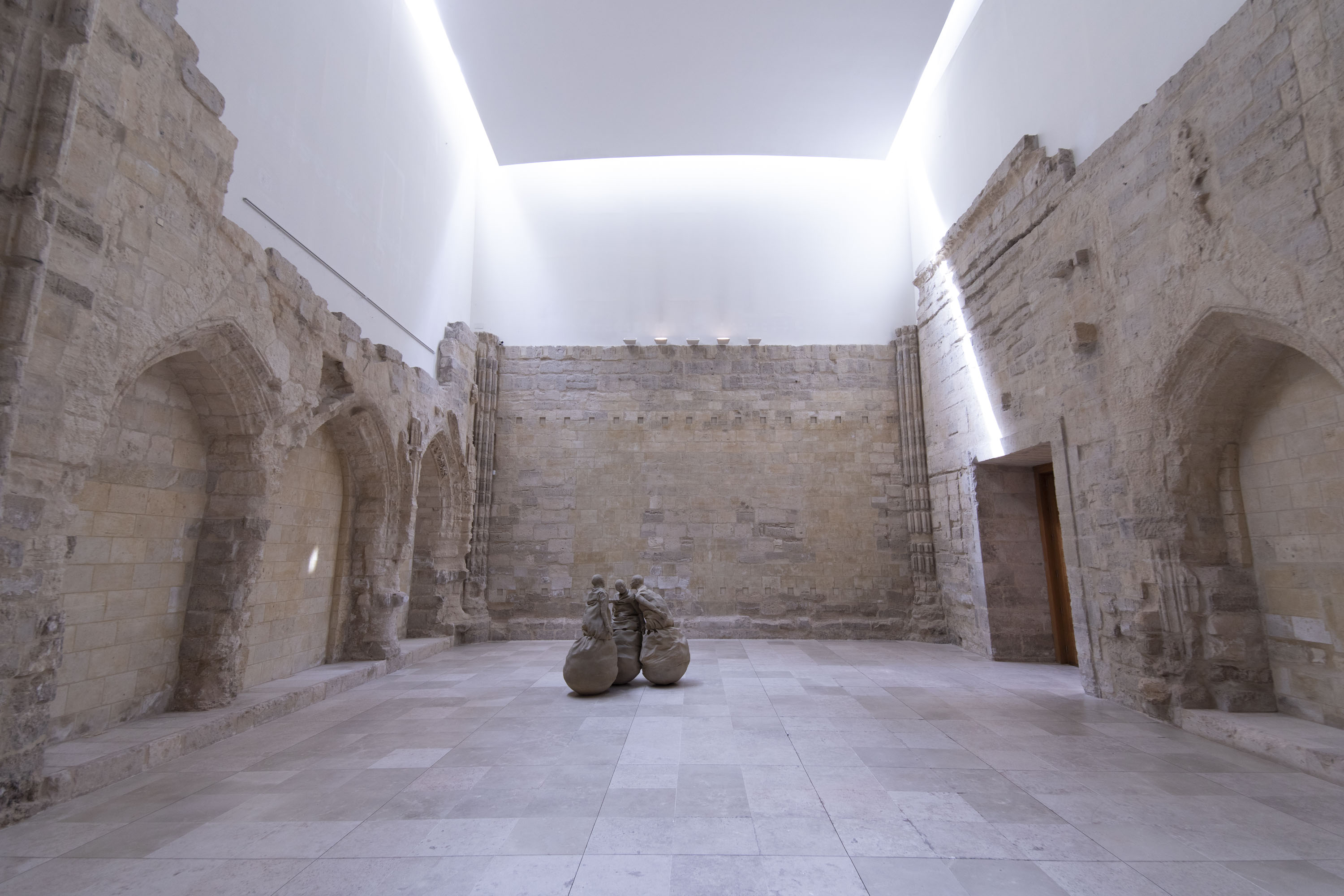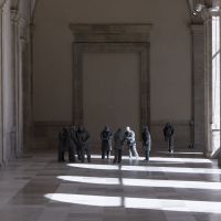Literature, and dramaturgy in particular, found a preeminent place in the artistic imaginary of Muñoz and his contemporaries back in the 1980s, something that conflicted with the tradition under which works of art said nothing that was not the result of reflection on art itself. In the case of Juan Muñoz, the theatricality in his work is narrative and spatial at the same time, a kind of language that is inscribed in the place and determines our relationship with the work of art. In this relationship lies one of the keys to understanding all the artist’s work, in not knowing if we can be part of it and in a disturbing lack of knowledge as to whether we are invited to take part in the silent conversation, if not discrepancy, of these figures that in principle would require our attention, just like any other work of art. This is one of the most visible paradoxes in the work of Juan Muñoz, approaching his groups of figures, such as Conversation Piece (Hirschhorn), dating from 1995, which inhabits the Chapel of the Counts of Fuensaldaña, and verifying the suspicion that our presence provokes in them, forcing us to rethink the place we hold at their side.