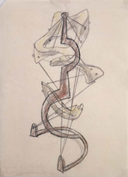El siguiente bloque de este grupo ha abandonado lo figurativo y adquiere formas inspiradas en objetos: ganchos, agujas, etcétera., pero sobre todo posee ya una gran proximidad a la Escultura Infinita. Ferrant no ocultó nunca su admiración por Julio González ni su inquietud por las raÃces del constructivismo. Debido a su interés por el dinamismo, por la vida de la escultura, ya habÃa explorado antes el movimiento de articulación y el de desplazamiento. Ahora, en 1957, sus dibujos desarrollan el movimiento de transformación formal de la pieza cambiando los puntos de enganche y generando asà otras configuraciones distintas según cada combinación. El tipo de enganche se propicia atravesando una forma con otra; disponiendo un eje central con piezas móviles, o ensayando también la tensión-distensión de cuerdas o alambres sobre estructuras recias de metal. Como conclusión a un largo periodo de reflexión sobre estas posibilidades que Ferrant inició en los años treinta, estos dibujos dan paso a la realización de maquetas y de piezas de hierro que serÃan ensambladas de mil maneras. La necesidad de saltar a lo tridimensional para desarrollar sus ideas se hizo acuciante en estos últimos años de su vida. Hizo realidad la idea del "dibujo en el espacio".