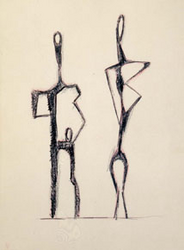 Aquà vemos otra forma de disposición de figuras: en grupos de dos o más. Las concepciones de la representación recuperan ideas iniciadas por Ferrant en los años treinta y cuarenta: las figuras lÃticas derivadas de su Escultura MegalÃtica, los idolillos prehistóricos, las figuras filiformes y una configuración esquemática pero de bloque único en las dos figuras que parecen adentrarse en un camino. Ferrant utiliza elementos que permiten la ubicación de las figuras en el espacio: traza lÃneas que hacen las veces de suelo, a veces rectas y en otros casos curvas, simulando lomas o pequeños promontorios. En el dibujo más coloreado de este grupo, Ferrant se entretiene incluso en trazar un camino amarillo en perspectiva -recurso que no aparece en otros dibujos- situando colores asociados a lo que representan: el amarillo de la tierra, el verde de la hierba y el azul del cielo. Las figuras estilizadas se derivan de las filiformes de los años treinta, poseen partes macizas y otras puramente lineales y, aunque aquà no se mezclan entre sÃ, anuncian algunas conjunciones del grupo siguiente.