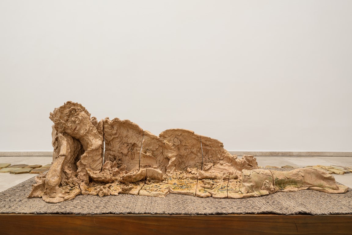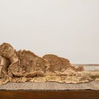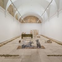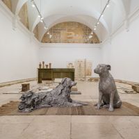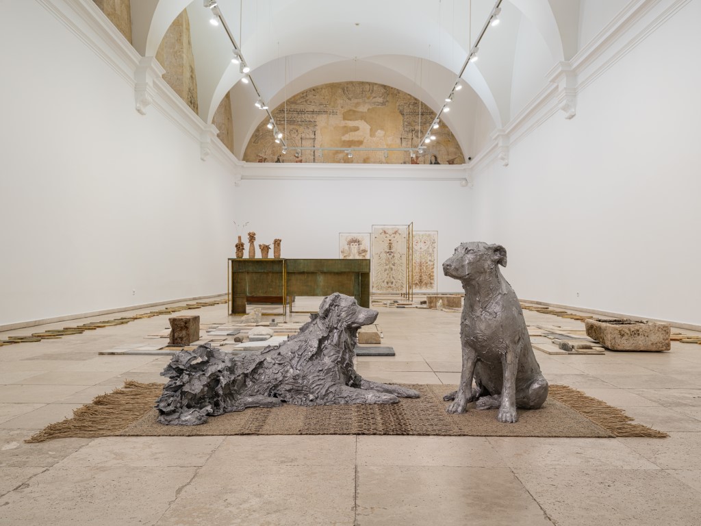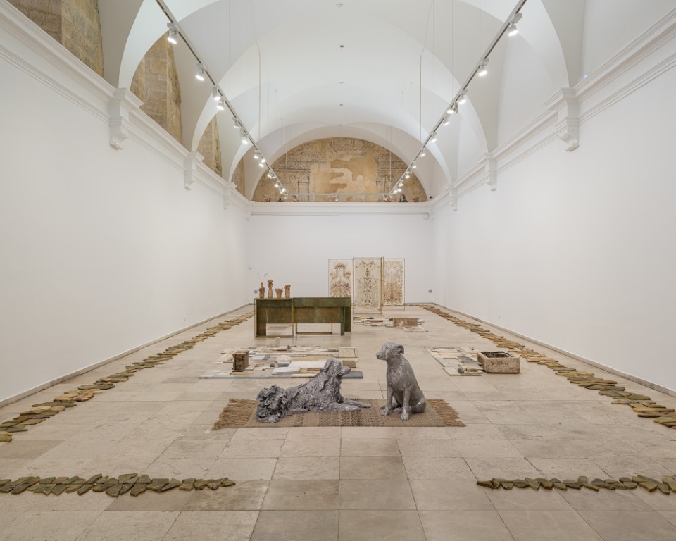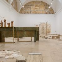 Two dogs greet visitors upon their arrival in Room 9. Camoni once again appeals thereby to distant traditions in which animals were integrated into architecture, in door jambs, lintels and friezes. What these dogs appeal to here, however, is an attachment to the earth. Both the dogs and the Odalisque, which she has created especially for this show, reveal the undeniable relationship with the material from which they are born, inviting us to think that they are always in process, in a perpetual state of becoming. Architecture consolidates its presence in the centre of the room, where we see the artist’s famous mosaics. Made of found pieces and scrabs of marble, they designate a place and give off that aroma of vestige, of the space that once was, like an archaeological site whose different rooms we can only guess at. In turn, Camoni has delimited the space with recycled onyx slabs that are also snakes because, like the columns, everything can be the same thing at the same time. In the background, brass structures hold silks on which we see spectral shapes taken directly from nature, in the manner of vegetal print. They evidence dubious presences, shrouded in the mystery that invariably arises when life and art come together.