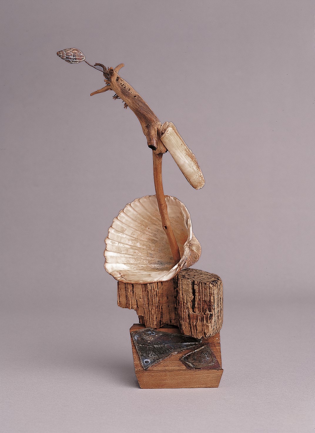 Madera, espejo, corcho, conchas y alambre